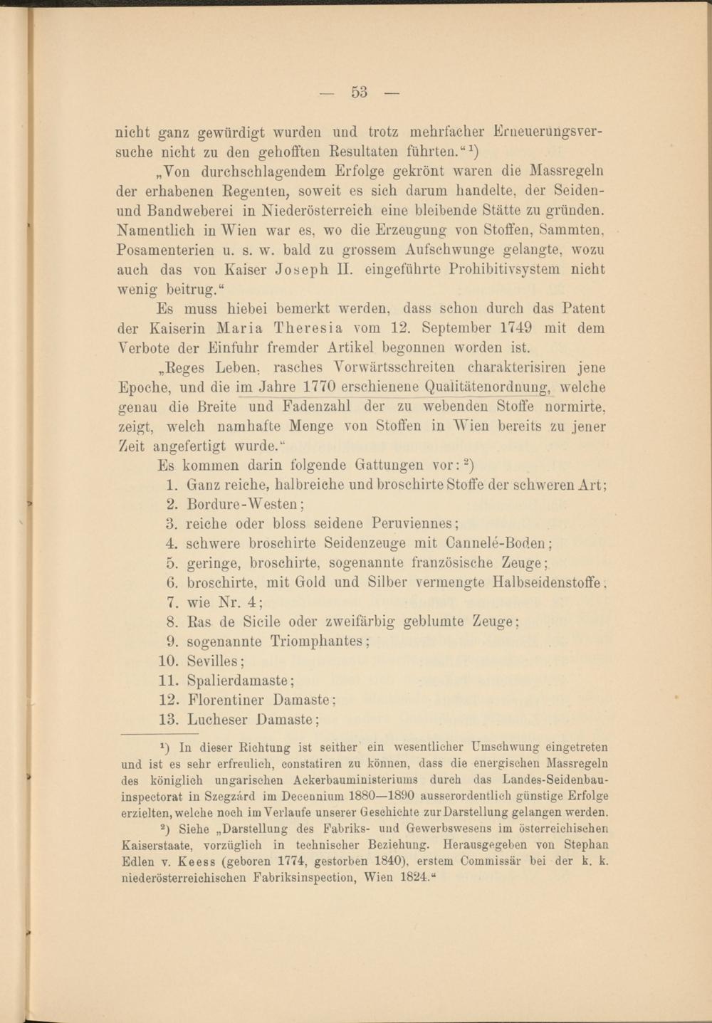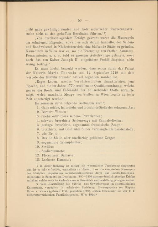 „Von durchschlagendem Erfolge gekrönt waren die Massregeln der erhabenen Regenten, soweit es sich darum handelte, der Seiden- und Bandweberei in Niederösterreich eine bleibende Stätte zu gründen. Namentlich in Wien war es, wo die Erzeugung von Stoffen, Sammten, Posamenterien u. s. w. bald zu grossem Aufschwünge gelangte, wozu auch das von Kaiser Joseph II. eingeführte Prohibitivsystem nicht wenig beitrug.“