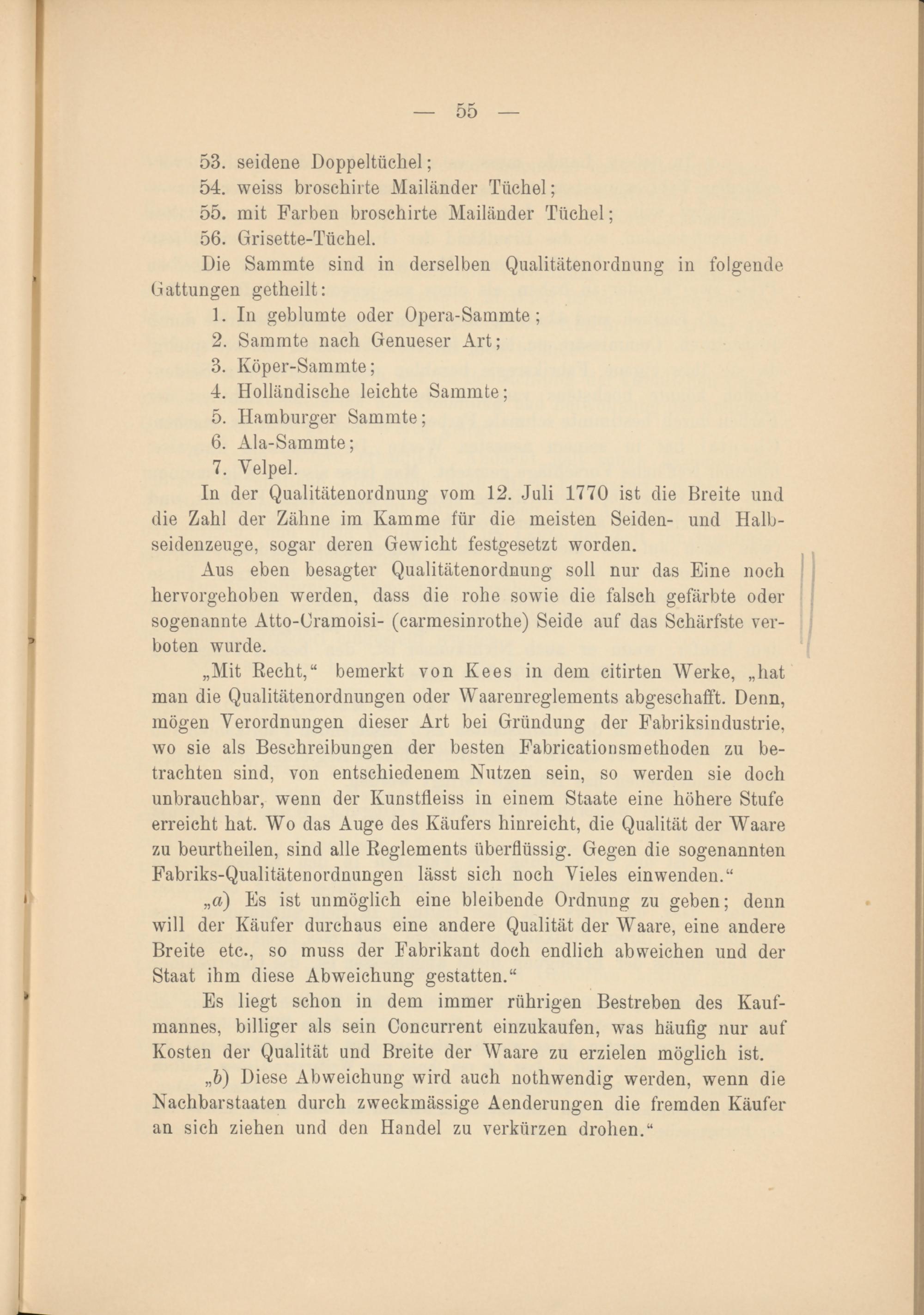 „Mit Recht,“ bemerkt von Kees in dem citirten Werke, „hat man die Qualitätenordnungen oder Waarenreglements abgeschafft. Denn, mögen Verordnungen dieser Art bei Gründung der Fabriksindustrie, wo sie als Beschreibungen der besten Fabricationsmethoden zu betrachten sind, von entschiedenem Nutzen sein, so werden sie doch unbrauchbar, wenn der Kunstfleiss in einem Staate eine höhere Stufe erreicht hat. Wo das Auge des Käufers hinreicht, die Qualität der Waare zu beurtheilen, sind alle Reglements überflüssig. Gegen die sogenannten Fabriks-Qualitätenordnungen lässt sich noch Vieles einwenden.“