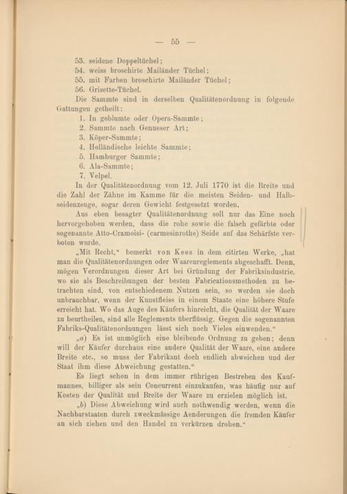 In der Qualitätenordnung vom 12. Juli 1770 ist die Breite und die Zahl der Zähne im Kamme für die meisten Seiden- und Halbseidenzeuge, sogar deren Gewicht festgesetzt worden.