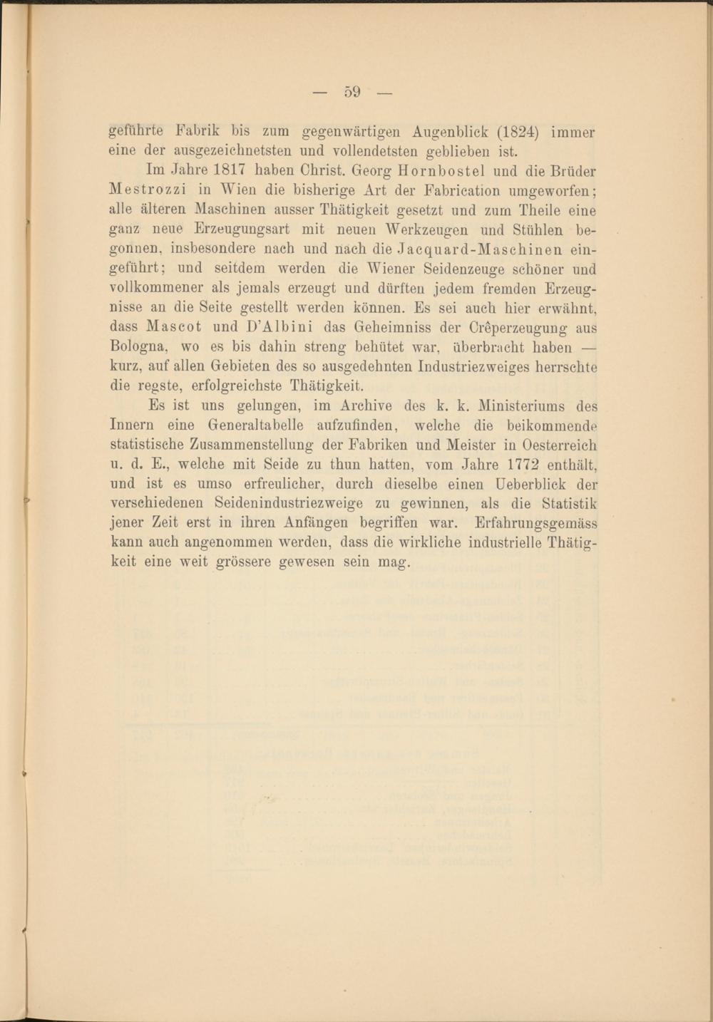 Im Jahre 1817 haben Christ. Georg Hornbostel und die Brüder Mestrozzi in Wien die bisherige Art der Fabrication umgeworfen; alle älteren Maschinen ausser Thätigkeit gesetzt und zürn Theile eine ganz neue Erzeugungsart mit neuen Werkzeugen und Stühlen begonnen, insbesondere nach und nach die Jacquard-Maschinen eingeführt; und seitdem werden die Wiener Seidenzeuge schöner und vollkommener als jemals erzeugt und dürften jedem fremden Erzeugnisse an die Seite gestellt werden können. Es sei auch hier erwähnt, dass Mas cot und D’Albini das Geheimniss der Creperzeugung aus Bologna, wo es bis dahin streng behütet war, überbracht haben — kurz, auf allen Gebieten des so ausgedehnten Industriezweiges herrschte die regste, erfolgreichste Thätigkeit.