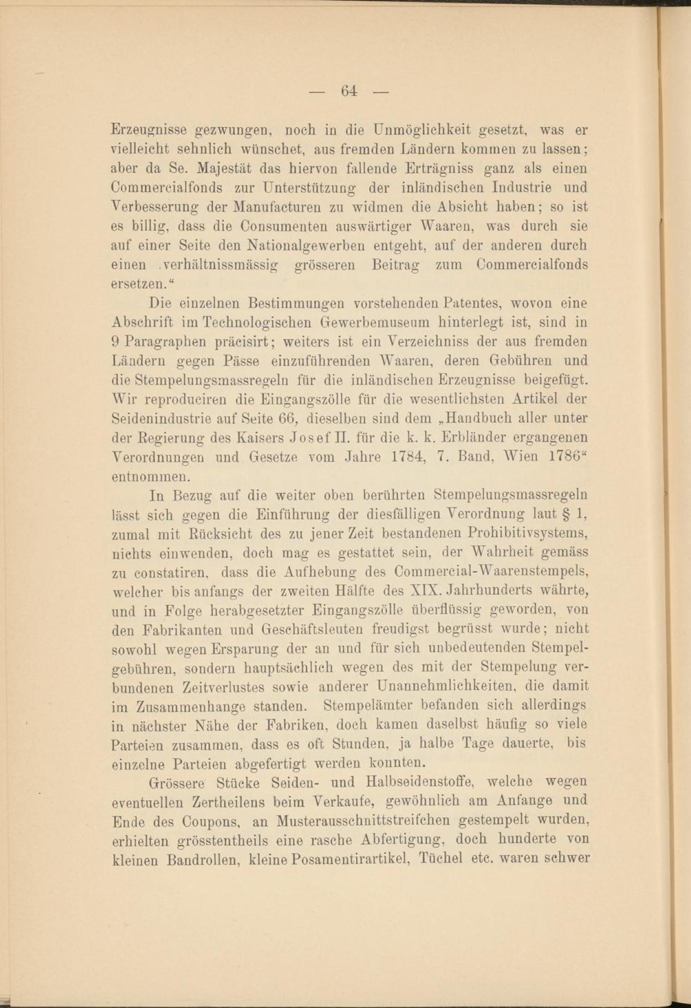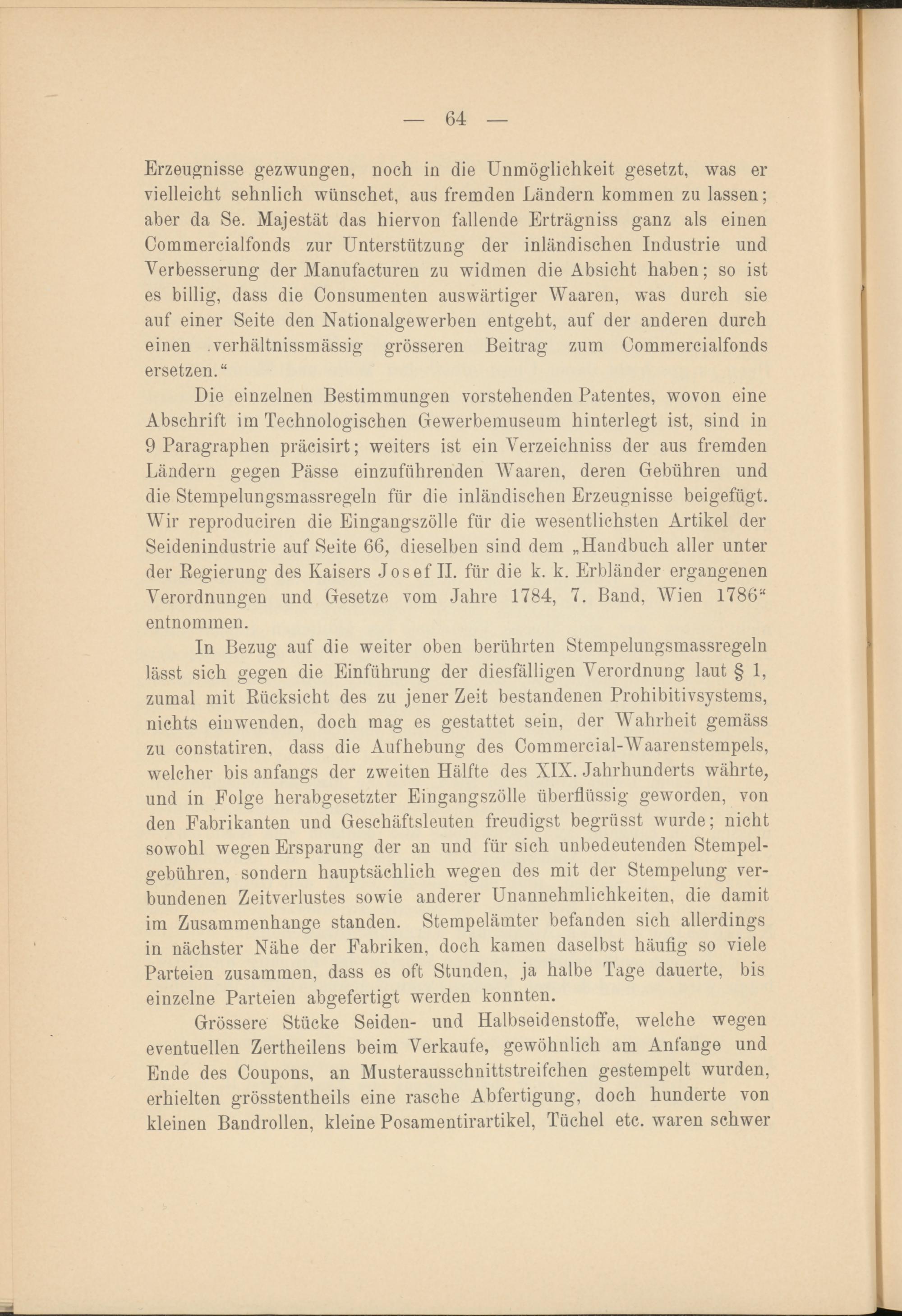 Die einzelnen Bestimmungen vorstehenden Patentes, wovon eine Abschrift im Technologischen Gewerbemuseum hinterlegt ist, sind in 9 Paragraphen präcisirt; weiters ist ein Verzeichniss der aus fremden Ländern gegen Pässe einzuführenden Waaren, deren Gebühren und die Stempelungsmassregeln für die inländischen Erzeugnisse beigefügt. Wir reproduciren die Eingangszölle für die wesentlichsten Artikel der Seidenindustrie auf Seite 66, dieselben sind dem „Handbuch aller unter der Regierung des Kaisers Josef II. für die k. k. Erbländer ergangenen Verordnungen und Gesetze vom Jahre 1784, 7. Band, Wien 1786“ entnommen.