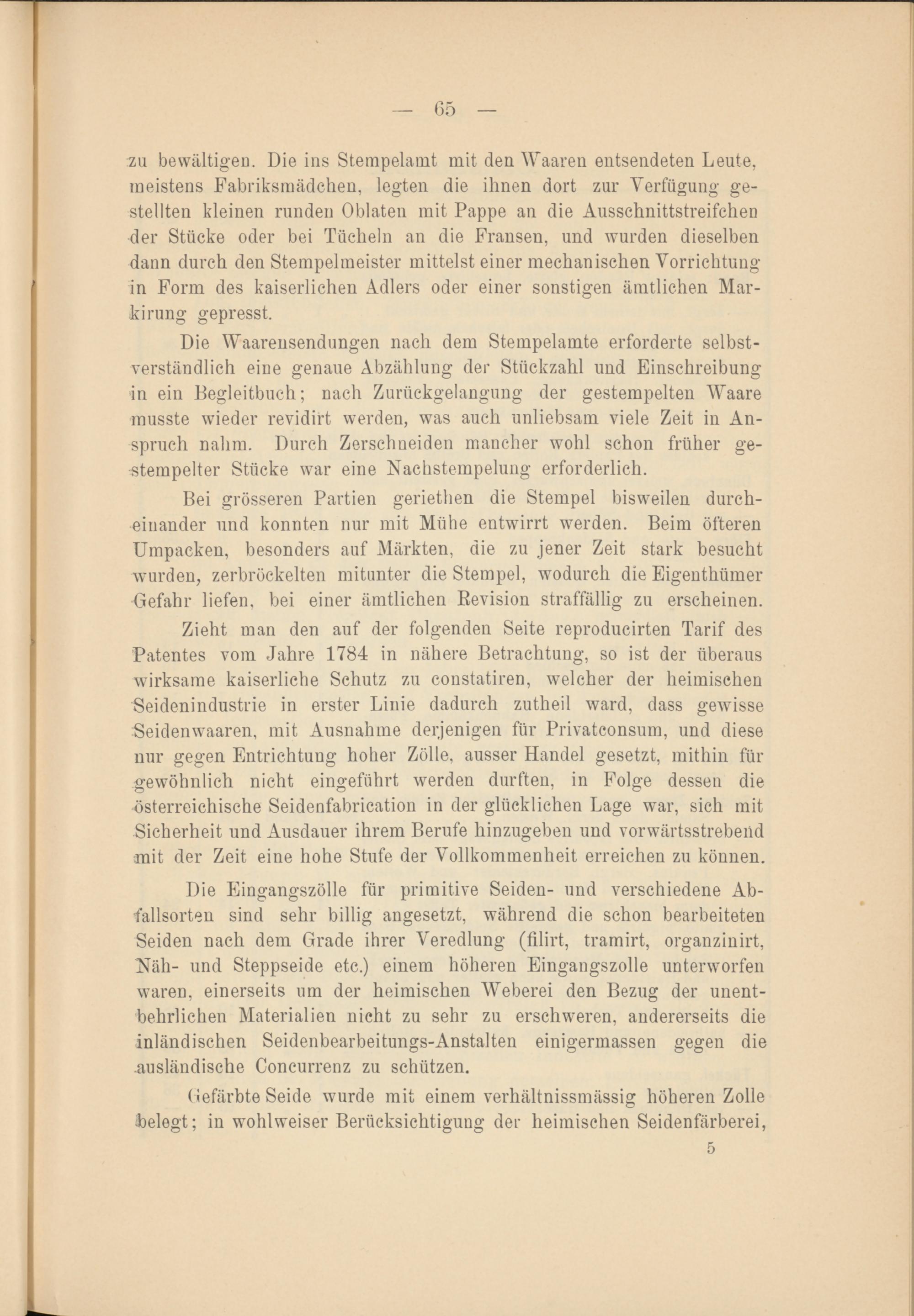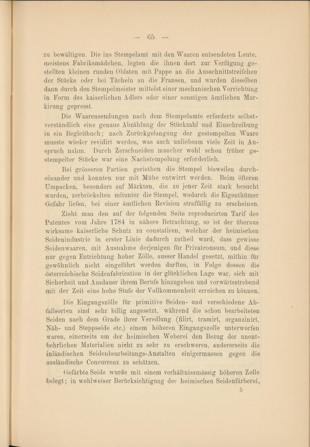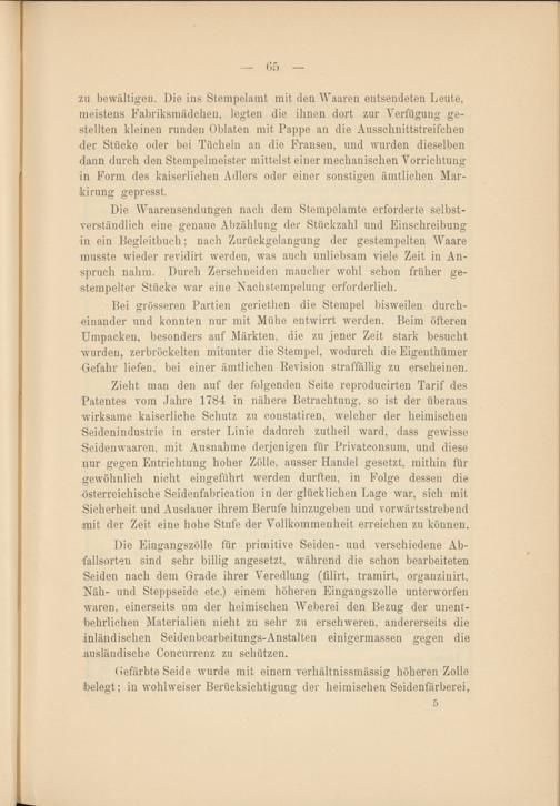 Zieht man den auf der folgenden Seite reproducirten Tarif des Patentes vom Jahre 1784 in nähere Betrachtung, so ist der überaus wirksame kaiserliche Schutz zu constatiren, welcher der heimischen Seidenindustrie in erster Linie dadurch zutheil ward, dass gewisse Seidenwaaren, mit Ausnahme derjenigen für Privatconsum, und diese nur gegen Entrichtung hoher Zölle, ausser Handel gesetzt, mithin für gewöhnlich nicht eingeführt werden durften, in Folge dessen die österreichische Seidenfabrication in der glücklichen Lage war, sich mit Sicherheit und Ausdauer ihrem Berufe hinzugeben und vorwärtsstrebend mit der Zeit eine hohe Stufe der Vollkommenheit erreichen zu können.
