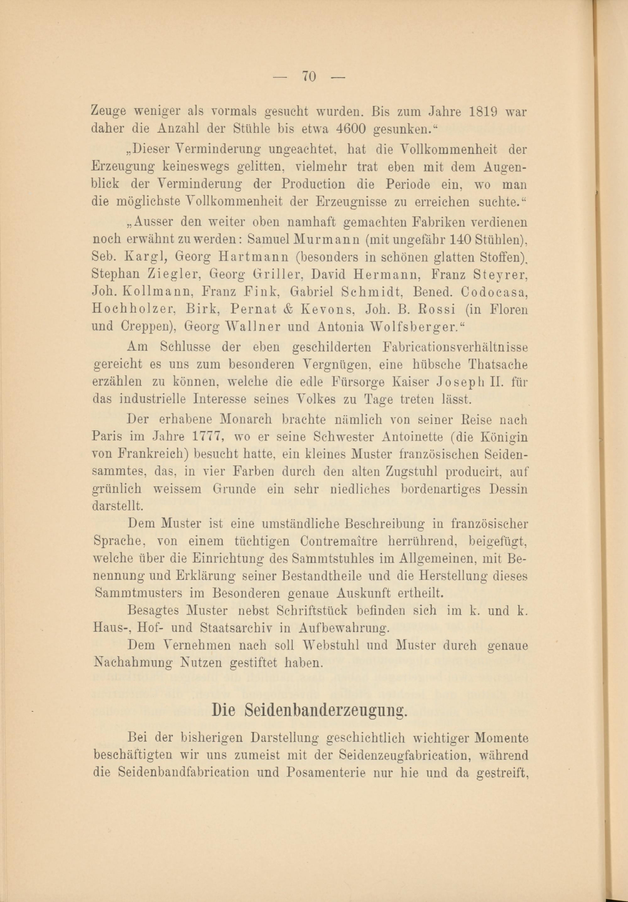 „Dieser Verminderung ungeachtet, hat die Vollkommenheit der Erzeugung keineswegs gelitten, vielmehr trat eben mit dem Augenblick der Verminderung der Production die Periode ein, wo man die möglichste Vollkommenheit der Erzeugnisse zu erreichen suchte.“ „Ausser den weiter oben namhaft gemachten Fabriken verdienen noch erwähnt zu werden: Samuel Murmann (mit ungefähr 140 Stühlen), Seb. Kargl, Georg Hartmann (besonders in schönen glatten Stoffen), Stephan Ziegler, Georg Griller, David Hermann, Franz Steyrer, Joh. Kollmann, Franz Fink, Gabriel Schmidt, Bened. Godocasa, Hochholzer, Birk, Pernat & Ivevons, Joh. B. Eossi (in Floren und Creppen), Georg Wallner und Antonia Wolfsberger.“
