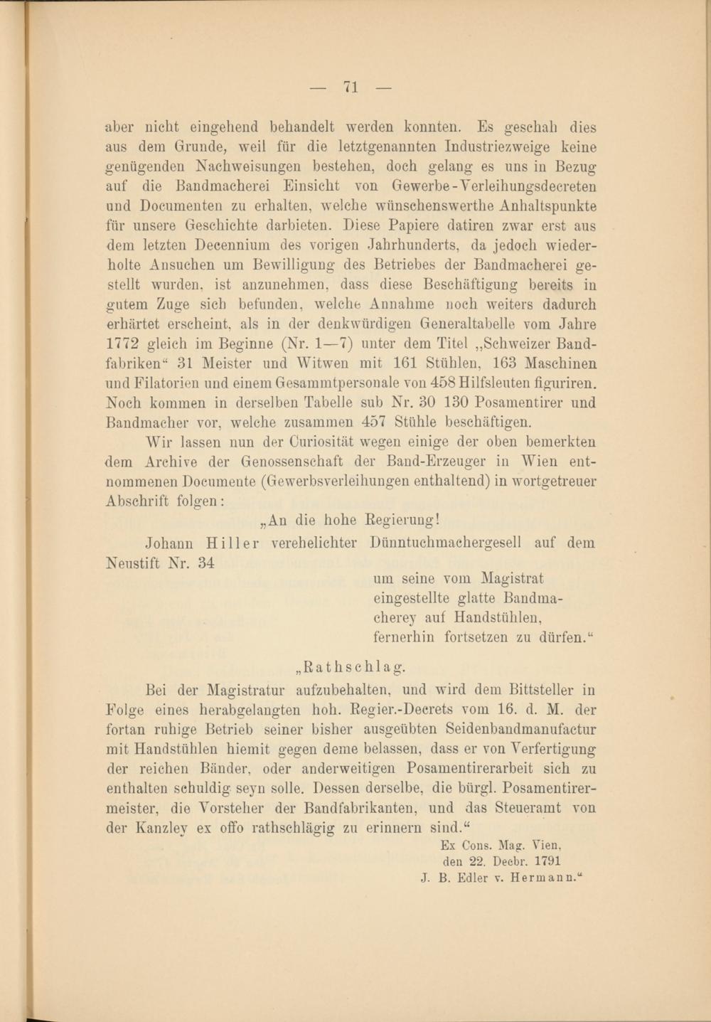 aber nicht eingehend behandelt werden konnten. Es geschah dies aus dem Grunde, weil für die letztgenannten Industriezweige keine genügenden Nachweisungen bestehen, doch gelang es uns in Bezug auf die Bandmacherei Einsicht von Gewerbe-Yerleihungsdecreten und Documenten zu erhalten, welche wlinschenswertlie Anhaltspunkte für unsere Geschichte darbieten. Diese Papiere datiren zwar erst aus dem letzten Decennium des vorigen Jahrhunderts, da jedoch wiederholte Ansuchen um Bewilligung des Betriebes der Bandmacherei gestellt wurden, ist anzunehmen, dass diese Beschäftigung bereits in gutem Zuge sich befunden, welche Annahme noch weiters dadurch erhärtet erscheint, als in der denkwürdigen Generaltabelle vom Jahre 1772 gleich im Beginne (Nr. 1—7) unter dem Titel „Schweizer Bandfabriken“ 31 Meister und Witwen mit 161 Stühlen, 163 Maschinen und Filatorien und einem Gesammtpersonale von 458 Hilfsleuten figuriren. Noch kommen in derselben Tabelle sub Nr. 30 130 Posamentirer und Bandmacher vor, welche zusammen 457 Stühle beschäftigen.