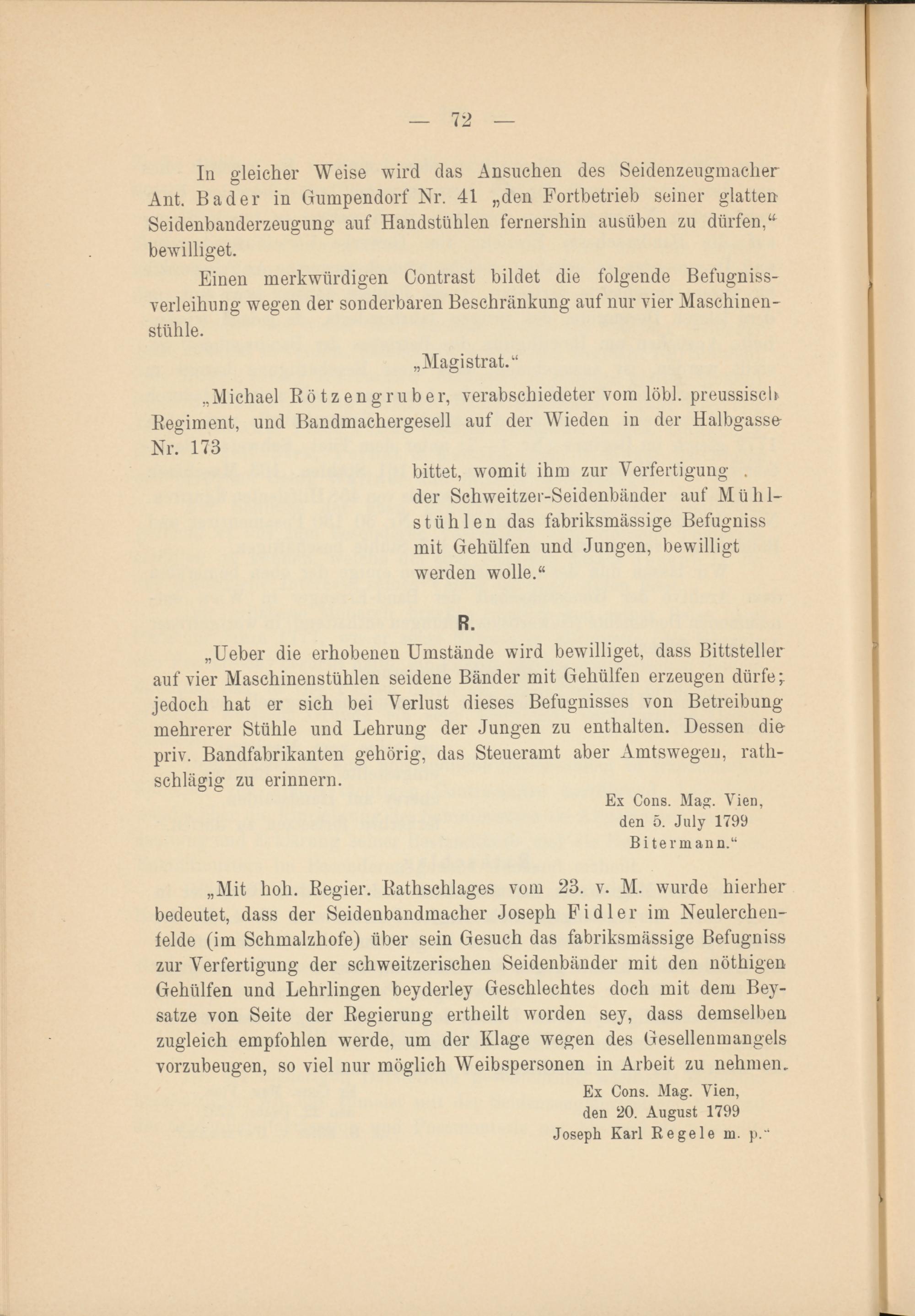 „Mit holl. Regier. Rathschlages vom 23. v. Al. wurde hierher bedeutet, dass der Seidenbandmacher Joseph Fidler im Neulerchenfelde (im Schmalzhofe) über sein Gesuch das fabriksmässige Befugniss zur Verfertigung der schweitzerischen Seidenbänder mit den nöthigen Gehülfen und Lehrlingen beyderley Geschlechtes doch mit dem Bey- satze von Seite der Regierung ertheilt worden sey, dass demselben zugleich empfohlen werde, um der Klage wegen des Gesellenmangels vorzubeugen, so viel nur möglich AVeibspersonen in Arbeit zu nehmen.