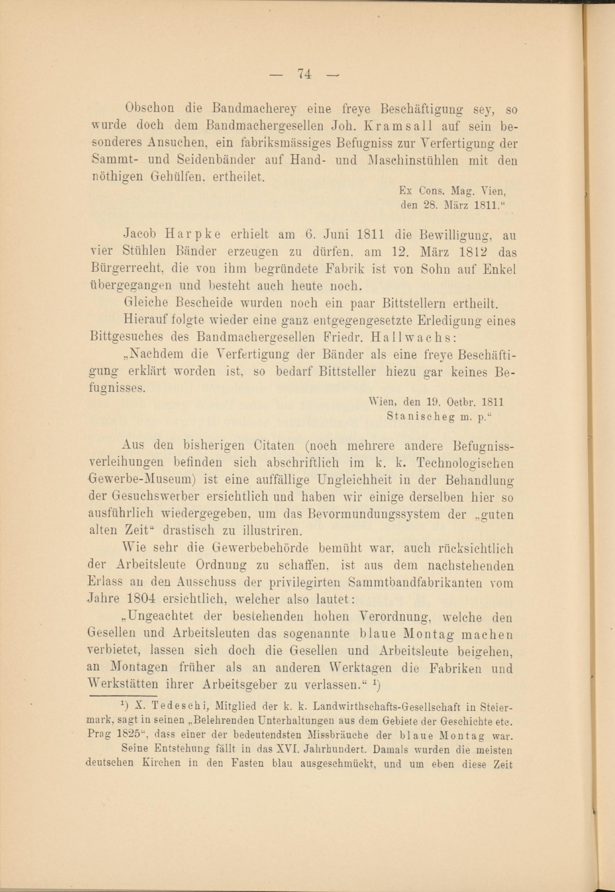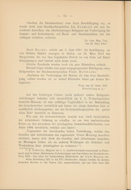 Obschon die Bandmacherey eine freye Beschäftigung- sey, so wurde doch dem Bandmachergesellen Joh. Kram sali auf sein besonderes Ansuchen, ein fabriksmässiges Befugniss zur Verfertigung der Sammt- und Seidenbänder auf Hand- und Maschinstühlen mit den nöthigen Gehiilfen. ertheilet.