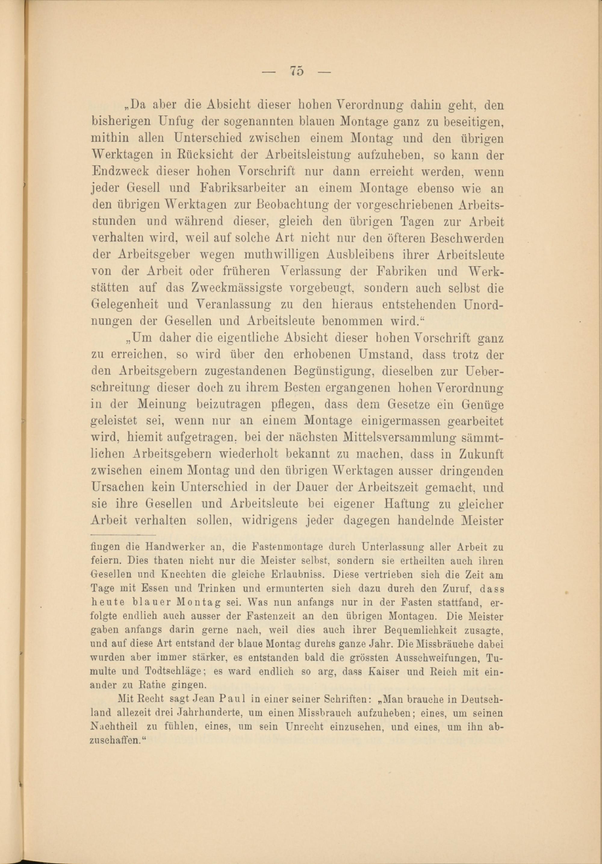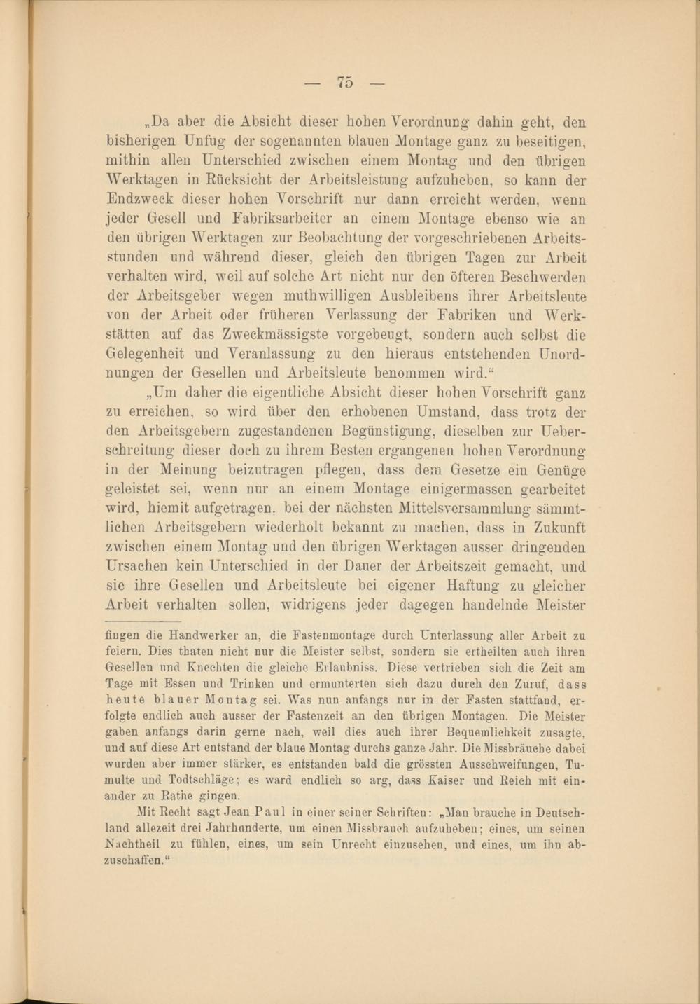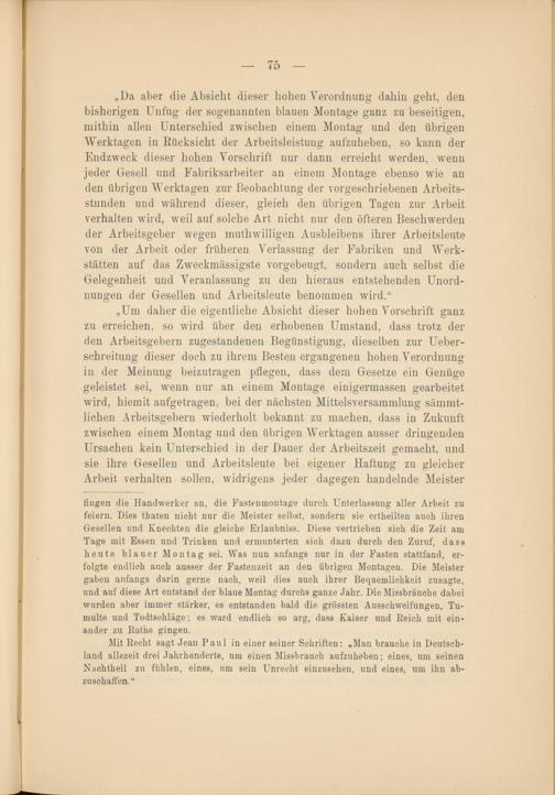 „Da aber die Absicht dieser hohen Verordnung dahin geht, den bisherigen Unfug der sogenannten blauen Montage ganz zu beseitigen, mithin allen Unterschied zwischen einem Montag und den übrigen Werktagen in Rücksicht der Arbeitsleistung aufzuheben, so kann der Endzweck dieser hohen Vorschrift nur dann erreicht werden, wenn jeder Gesell und Fabriksarbeiter an einem Montage ebenso wie an den übrigen Werktagen zur Beobachtung der vorgeschriebenen Arbeitsstunden und während dieser, gleich den übrigen Tagen zur Arbeit verhalten wird, weil auf solche Art nicht nur den öfteren Beschwerden der Arbeitsgeber wegen muthwilligen Ausbleibens ihrer Arbeitsleute von der Arbeit oder früheren Verfassung der Fabriken und Werkstätten auf das Zweckmässigste vorgebeugt, sondern auch selbst die Gelegenheit und Veranlassung zu den hieraus entstehenden Unordnungen der Gesellen und Arbeitsleute benommen wird.“