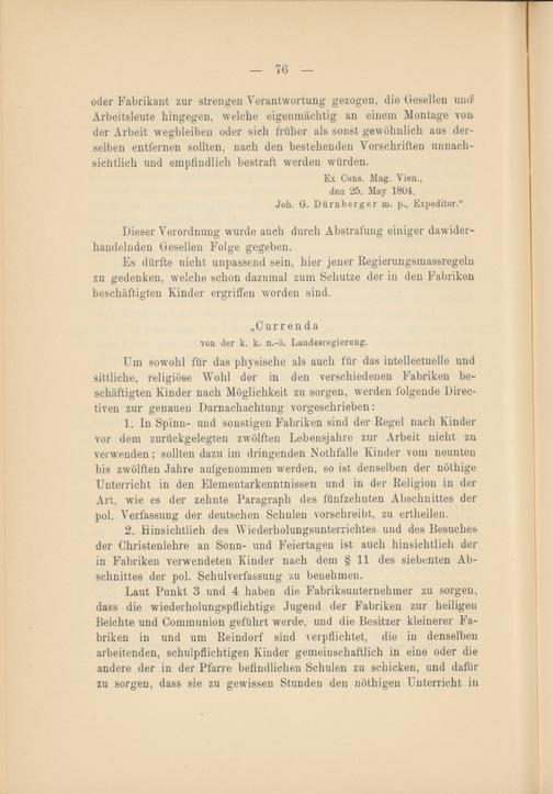 Laut Punkt 3 und 4 haben die Fabriksunternehmer zu sorgen, dass die wiederholungspflichtige Jugend der Fabriken zur heiligen Beichte und Communion geführt werde, und die Besitzer kleinerer Fabriken in und um Reindorf sind verpflichtet, die in denselben arbeitenden, schulpflichtigen Kinder gemeinschaftlich in eine oder die andere der in der Pfarre befindlichen Schulen zu schicken, und dafür zu sorgen, dass sie zu gewissen Stunden den nöthigen Unterricht in