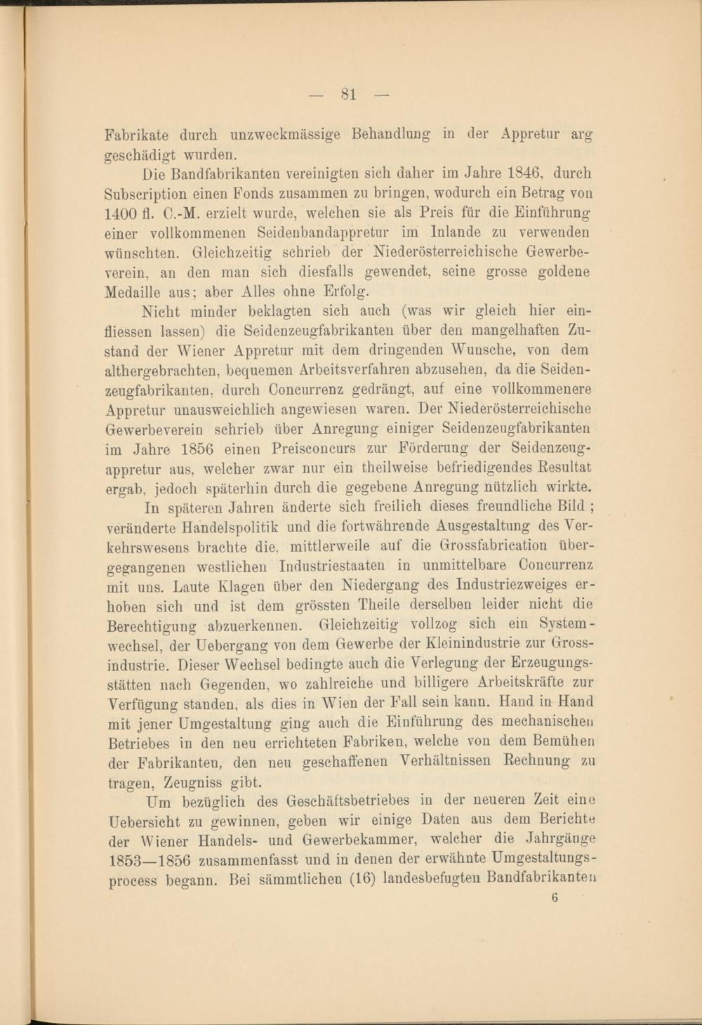 Um bezüglich des Geschäftsbetriebes in der neueren Zeit eine Uebersicht zu gewinnen, geben wir einige Daten aus dem Berichte der Wiener Handels- und Gewerbekammer, welcher die Jahrgänge 1853—1856 zusammenfasst und in denen der erwähnte Umgestaltungs- process begann. Bei sämmtlichen (16) landesbefugten Bandfabrikanten