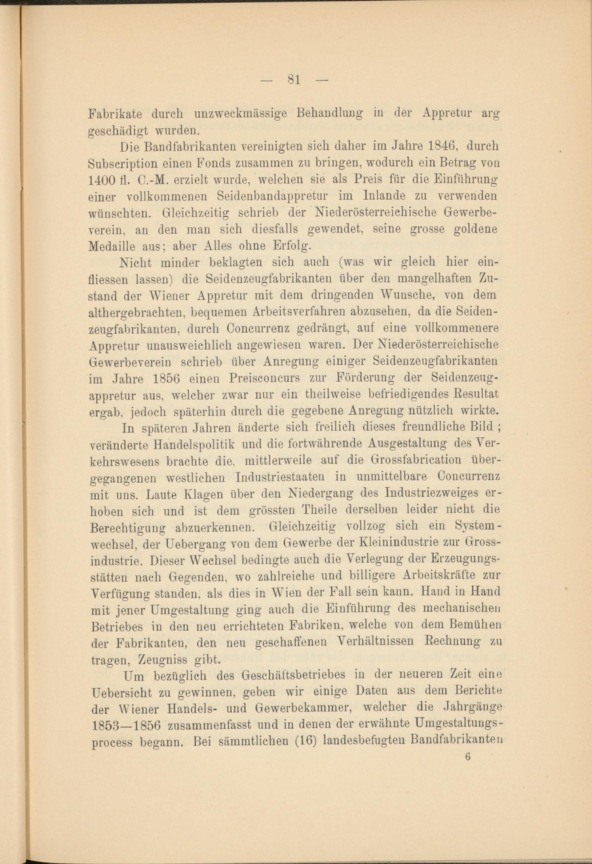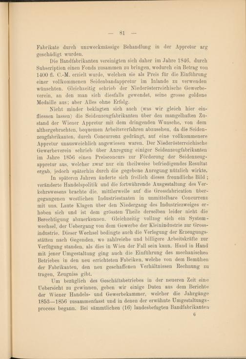 Nicht minder beklagten sich auch (was wir gleich hier ein- fliessen lassen) die Seidenzeugfabrikanten über den mangelhaften Zustand der Wiener Appretur mit dem dringenden Wunsche, von dem althergebrachten, bequemen Arbeitsverfahren abzusehen, da die Seiden- zeugfabrikanten, durch Concurrenz gedrängt, auf eine vollkommenere Appretur unausweichlich angewiesen waren. Der Niederösterreichische Gewerbeverein schrieb über Anregung einiger Seidenzeugfabrikanten im Jahre 1856 einen Preisconcurs zur Förderung der Seidenzeugappretur aus, welcher zwar nur ein theilweise befriedigendes Resultat ergab, jedoch späterhin durch die gegebene Anregung nützlich wirkte.