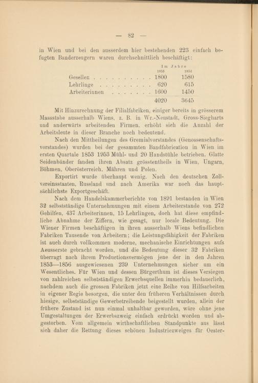 Nach den Mittheilungen des Gremialvorstandes (Genossenschaftsvorstandes) wurden bei der gesammten Bandfabrication in Wien im ersten Quartale 1853 1953 Mühl-und 20 Handstühle betrieben. Glatte Seidenbänder fanden ihren Absatz grösstentheils in Wien, Ungarn, Böhmen, Oberösterreich, Mähren und Polen.