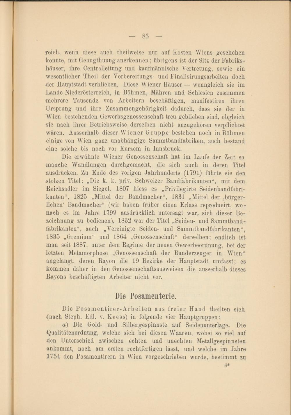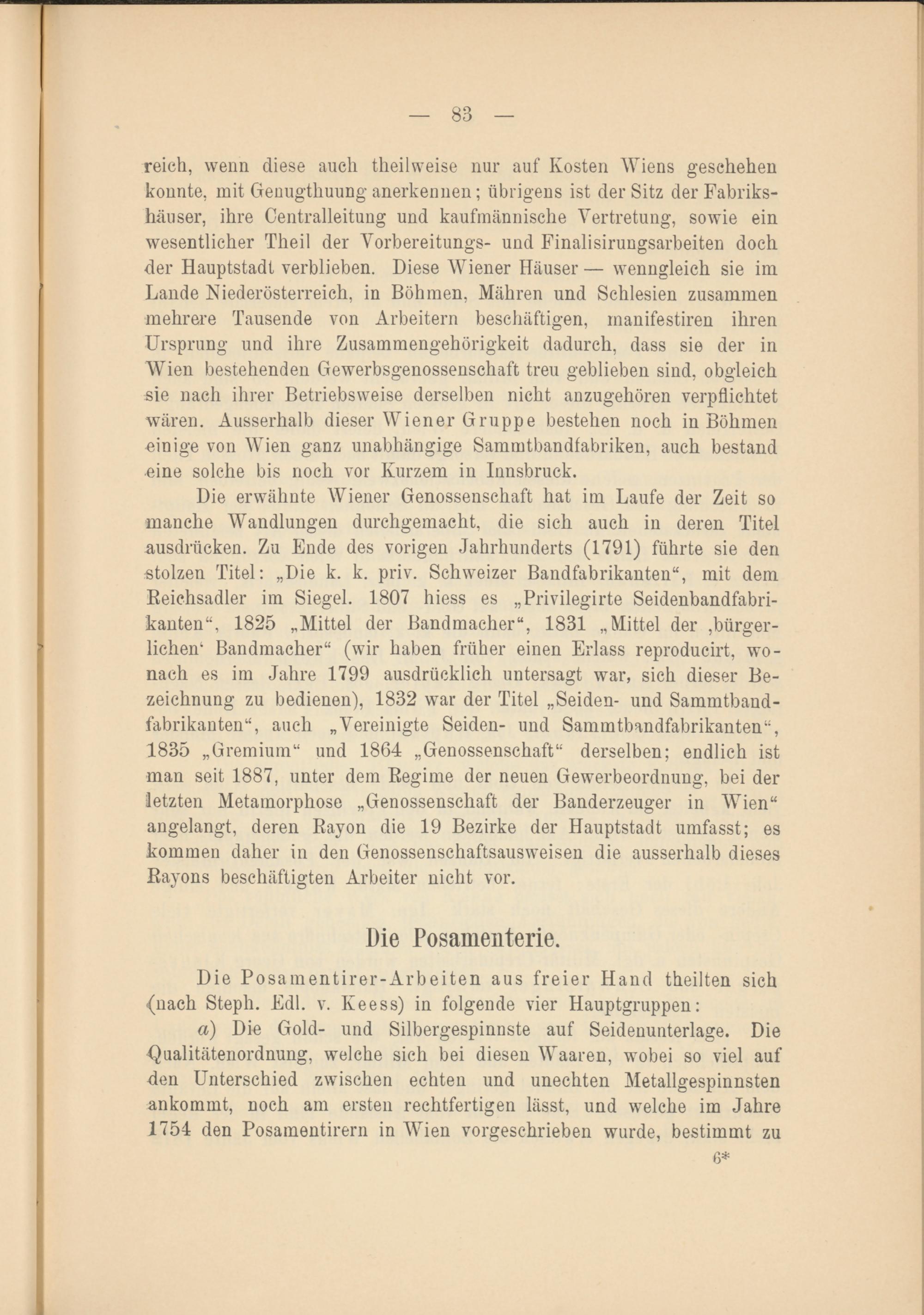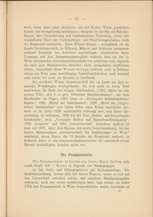 Die erwähnte Wiener Genossenschaft hat im Laufe der Zeit so manche Wandlungen durchgemacht, die sich auch in deren Titel ausdriicken. Zu Ende des vorigen Jahrhunderts (1791) führte sie den stolzen Titel: „Die k. k. priv. Schweizer Bandfabrikanten“, mit dem Reichsadler im Siegel. 1807 hiess es „Privilegirte Seidenbandfabrikanten“, 1825 „Mittel der Bandmacher“, 1831 „Mittel der bürgerlichen 1 Bandmacher“ (wir haben früher einen Erlass reproducirt, wonach es im Jahre 1799 ausdrücklich untersagt war, sich dieser Bezeichnung zu bedienen), 1832 war der Titel „Seiden- und Sammtband- fabrikanten“, auch „Vereinigte Seiden- und Sammtbandfabrikanten“, 1835 „Gremium“ und 1864 „Genossenschaft“ derselben; endlich ist man seit 1887, unter dem Regime der neuen Gewerbeordnung, bei der letzten Metamorphose „Genossenschaft der Banderzeuger in Wien“ angelangt, deren Rayon die 19 Bezirke der Hauptstadt umfasst; es kommen daher in den Genossenschaftsausweisen die ausserhalb dieses Rayons beschäftigten Arbeiter nicht vor.