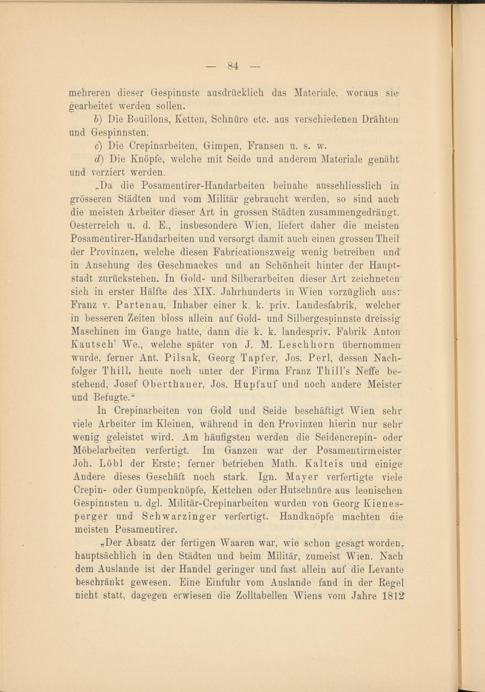 „Da die Posamentirer-Handarbeiten beinahe ausschliesslich in grösseren Städten und vom Militär gebraucht werden, so sind auch die meisten Arbeiter dieser Art in grossen Städten zusammengedrängt. Oesterreich u. d. E., insbesondere Wien, liefert daher die meisten Posamentirer-Handarbeiten und versorgt damit auch einen grossen Theil der Provinzen, welche diesen Fabricationszweig wenig betreiben und in Ansehung des Geschmackes und an Schönheit hinter der Hauptstadt zurückstehen. In Gold- und Silberarbeiten dieser Art zeichneten sich in erster Hälfte des XIX. Jahrhunderts in Wien vorzüglich aus: Franz v. Partenau, Inhaber einer k. k. priv. Landesfabrik, welcher in besseren Zeiten bloss allein auf Gold- und Silbergespinnste dreissig Maschinen im Gange hatte, dann die k. k. landespriv. Fabrik Anton Kautsch’ We., welche später von J. M. Leschhorn übernommen wurde, ferner Ant. Pilsak, Georg Tapfer, Jos. Perl, dessen Nachfolger Thill, heute noch unter der Firma Franz Thill’s Neffe bestehend, Josef Oberthaner, Jos. Hupfauf und noch andere Meister und Befugte.“