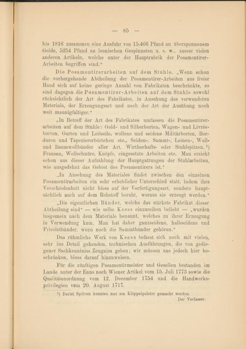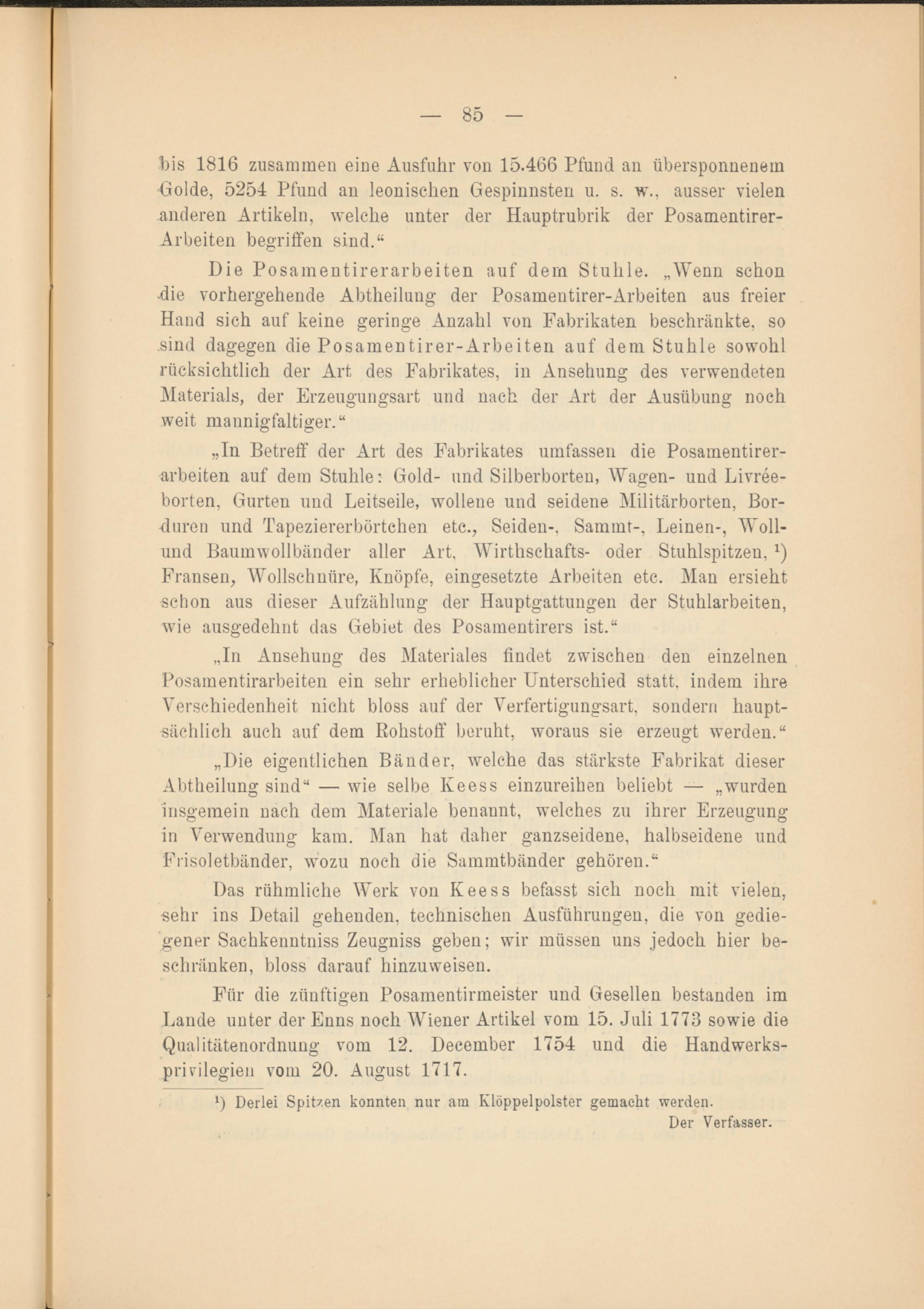 Für die zünftigen Posamentirmeister und Gesellen bestanden im Lande unter der Enns noch Wiener Artikel vom 15. Juli 1773 sowie die Qualitätenordnung vom 12. Deeember 1754 und die Handwerksprivilegien vom 20. August 1717.