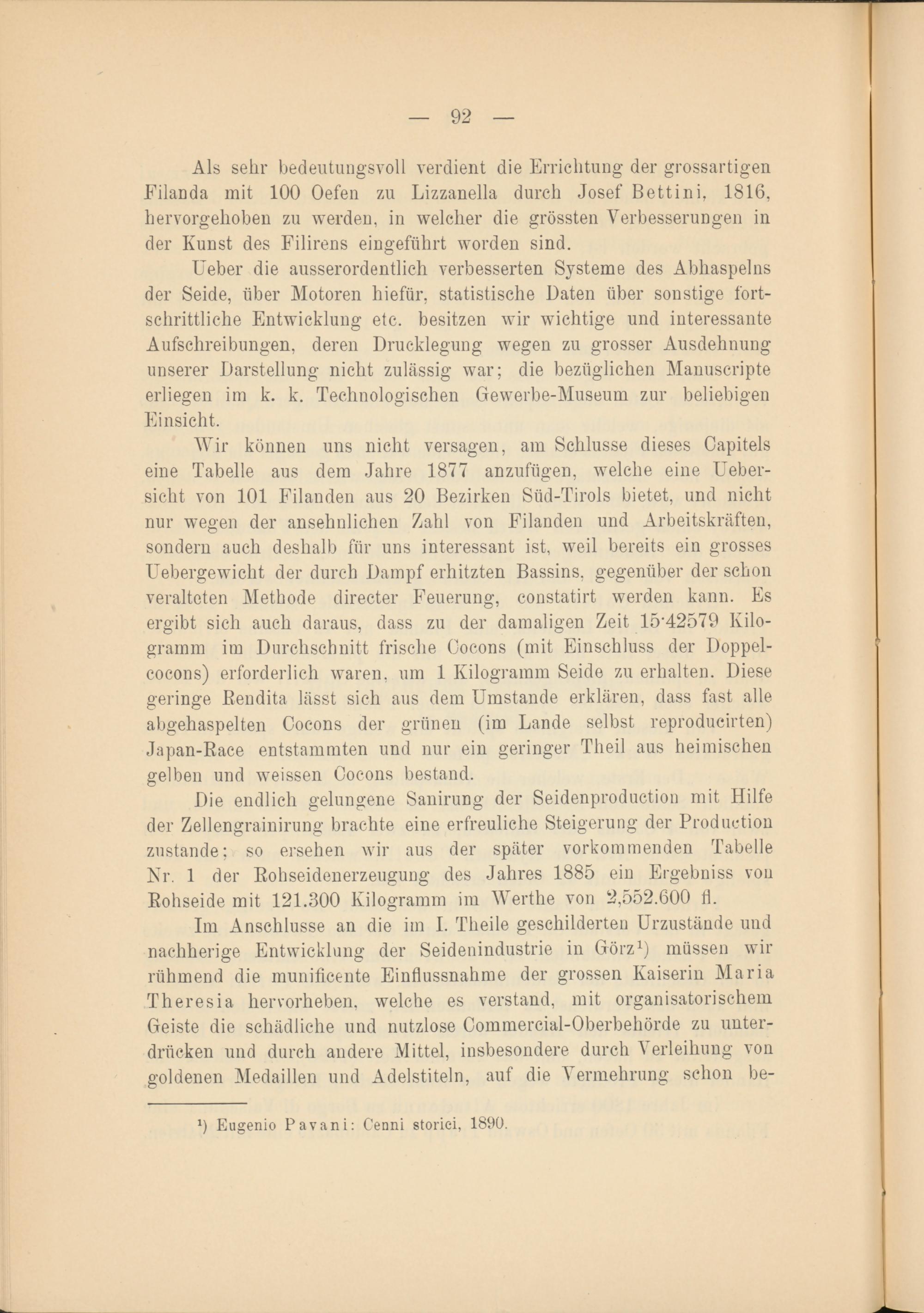 "Wir können uns nicht versagen, am Schlüsse dieses Capitels eine Tabelle aus dem Jahre 1877 anzufügen, welche eine Ueber- sicht von 101 Filanden aus 20 Bezirken Süd-Tirols bietet, und nicht nur wegen der ansehnlichen Zahl von Filanden und Arbeitskräften, sondern auch deshalb für uns interessant ist, weil bereits ein grosses Uebergewicht der durch Dampf erhitzten Bassins, gegenüber der schon veralteten Methode directer E'euerung, constatirt werden kann. Es ergibt sich auch daraus, dass zu der damaligen Zeit 15'42579 Kilogramm im Durchschnitt frische Cocons (mit Einschluss der Doppel- cocons) erforderlich waren, um 1 Kilogramm Seide zu erhalten. Diese geringe Bendita lässt sich aus dem Umstande erklären, dass fast alle abgehaspelten Cocons der grünen (im Lande selbst reproducirten) Japan-Race entstammten und nur ein geringer Theil aus heimischen gelben und weissen Cocons bestand.