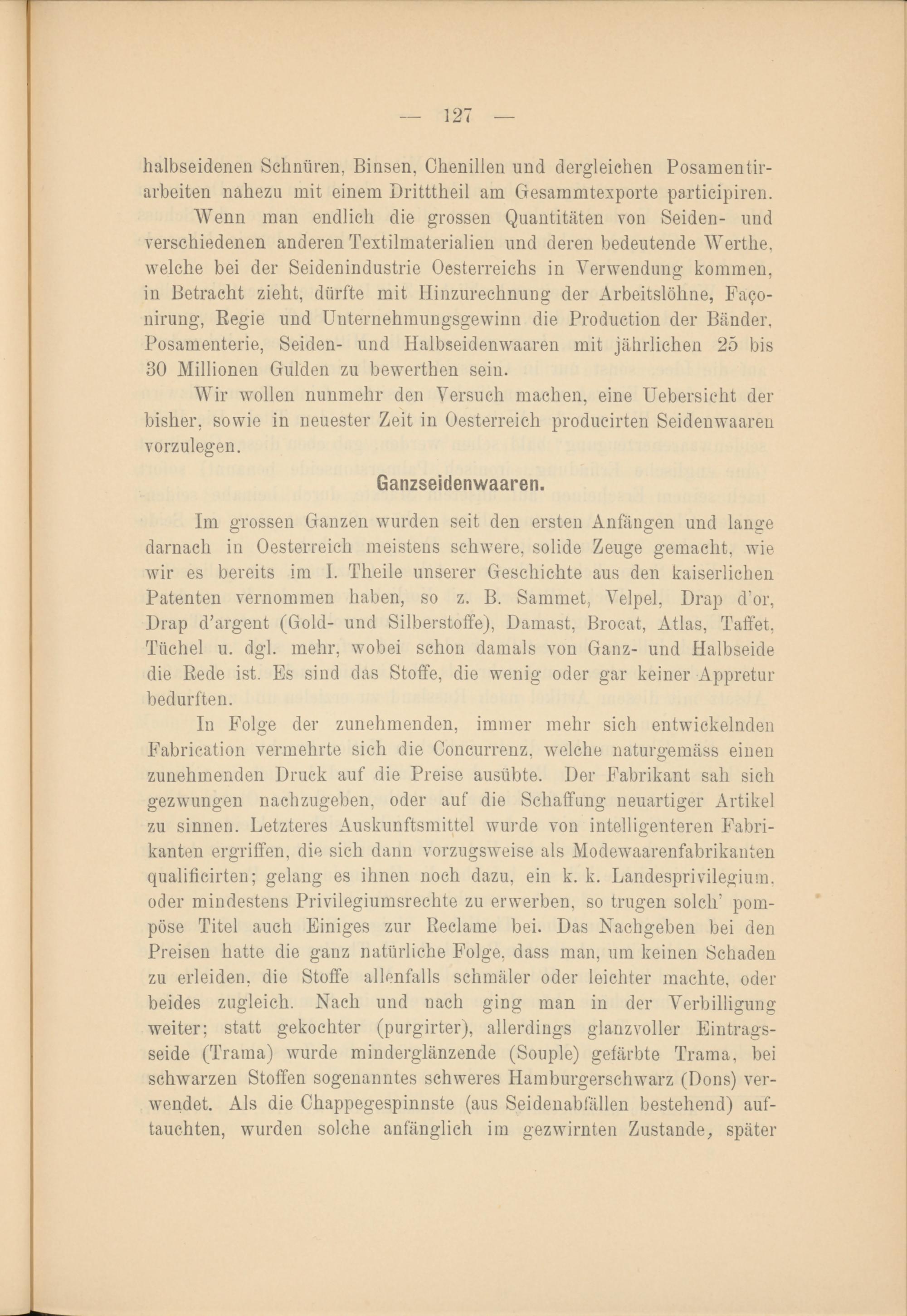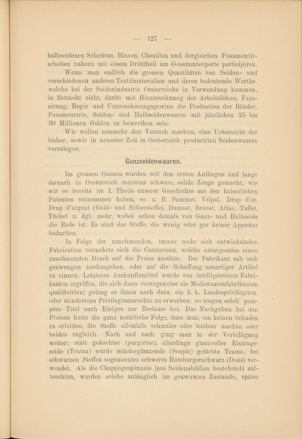 Im grossen Ganzen wurden seit den ersten Anfängen und lange darnach in Oesterreich meistens schwere, solide Zeuge gemacht, wie wir es bereits im 1. Theile unserer Geschichte aus den kaiserlichen Patenten vernommen haben, so z. B. Sammet, A T elpel, Drap d’or, Drap d’argent (Gold- und Silberstoffe), Damast, Brocat, Atlas, Taffet, Tüchel u. dgl. mehr, wobei schon damals von Ganz- und Halbseide die Rede ist. Es sind das Stoffe, die wenig oder gar keiner Appretur bedurften.