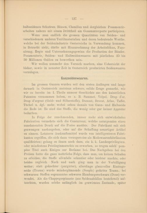 AVenn man endlich die grossen Quantitäten von Seiden- und verschiedenen anderen Textilmaterialien und deren bedeutende AVerthe, welche bei der Seidenindustrie Oesterreichs in Anwendung kommen, in Betracht zieht, dürfte mit Hinzurechnung der Arbeitslöhne, Fa^o- nirung, Regie und Unternehmungsgewinn die Production der Bänder, Posamenterie, Seiden- und Halbseidenwaaren mit jährlichen 25 bis 30 Millionen Gulden zu bewerthen sein.