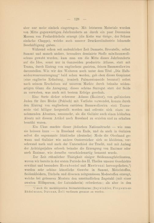 Eine Sorte dicker schwerer Atlasse (ß&zimor), von galiziscnen Juden für ihre Röcke (Pekisch) mit Vorliebe verwendet, konnte durch den Eintrag von englischem carrirten Baumwollzwirn statt Trama- seide viel billiger hergestellt werden und erfreute sich eines zunehmenden Absatzes, umsomehr, als die Galizier auch einen lebhaften Absatz mit diesem Artikel nach Russland zu erzielen und zu erhalten bemüht waren.