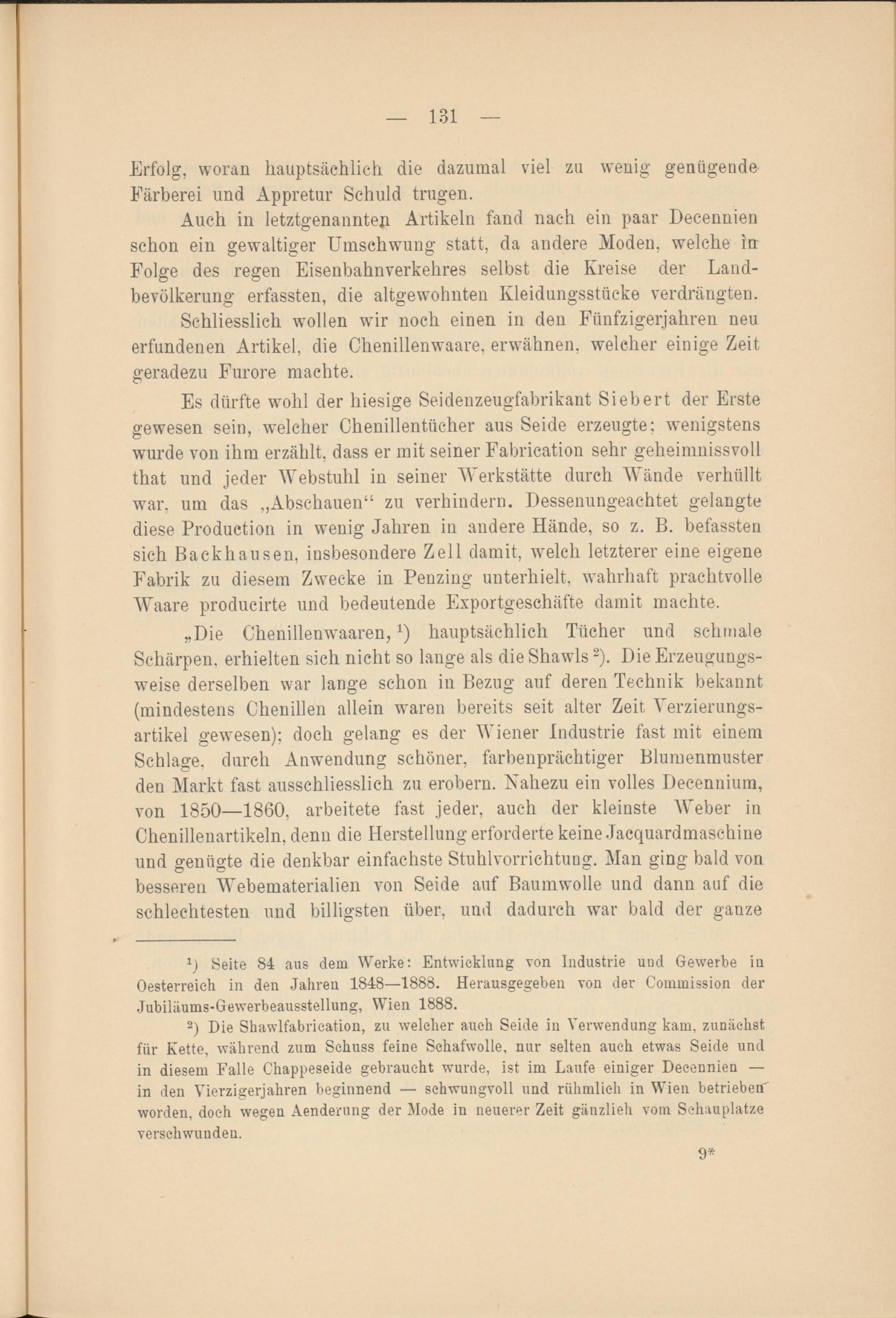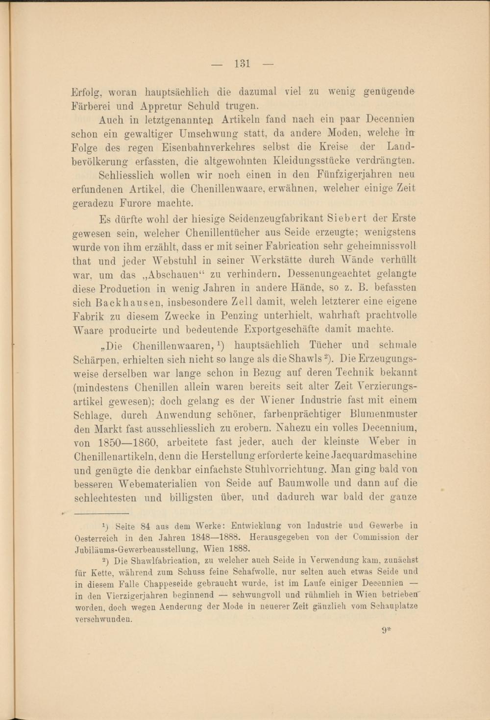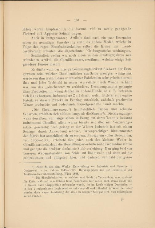 2 ) Die Shawlfabrieation, zu welcher auch Seide in Verwendung kam, zunächst für Kette, während zum Schuss feine Schafwolle, nur selten auch etwas Seide und in diesem Falle Chappeseide gebraucht wurde, ist im Laufe einiger Decennien — in den Vierzigerjahren beginnend — schwungvoll und rühmlich in Wien betrieberf worden, doch wegen Aenderung der Mode in neuerer Zeit gänzlieh vom Schauplatze verschwunden.