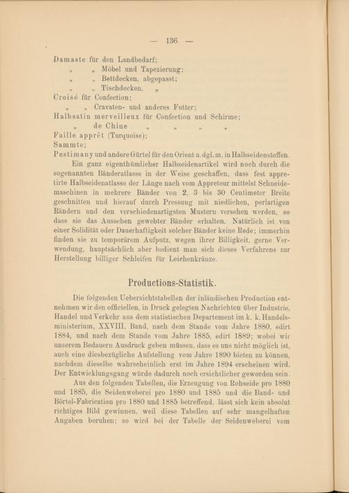 Die folgenden Uebersiehtstabellen der inländischen Production entnehmen wir den officiellen, in Druck gelegten Nachrichten über Industrie, Handel und Verkehr aus dem statistischen Departement im k. k. Handelsministerium, XXVIII. Band, nach dem Stande vom Jahre 1880, edirt 1884, und nach dem Stande vom Jahre 1885, edirt 1889; wobei wir unserem Bedauern Ausdruck geben müssen, dass es uns nicht möglich ist, auch eine diesbezügliche Aufstellung vom Jahre 1890 bieten zu können, nachdem dieselbe wahrscheinlich erst im Jahre 1894 erscheinen wird. Der Entwicklungsgang würde dadurch noch ersichtlicher geworden sein.