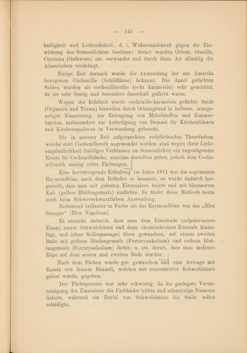Einige Zeit darnach wurde die Anwendung der aus Amerika bezogenen Cochenille (Schildläuse) bekannt. Die damit gefärbten Seiden wurden als cochenillerothe (echt karmoisin) sehr geschätzt, da sie sehr feurig und besonders dauerhaft gefärbt waren.