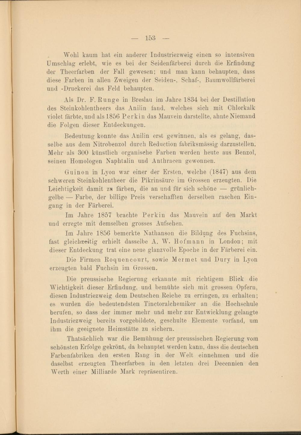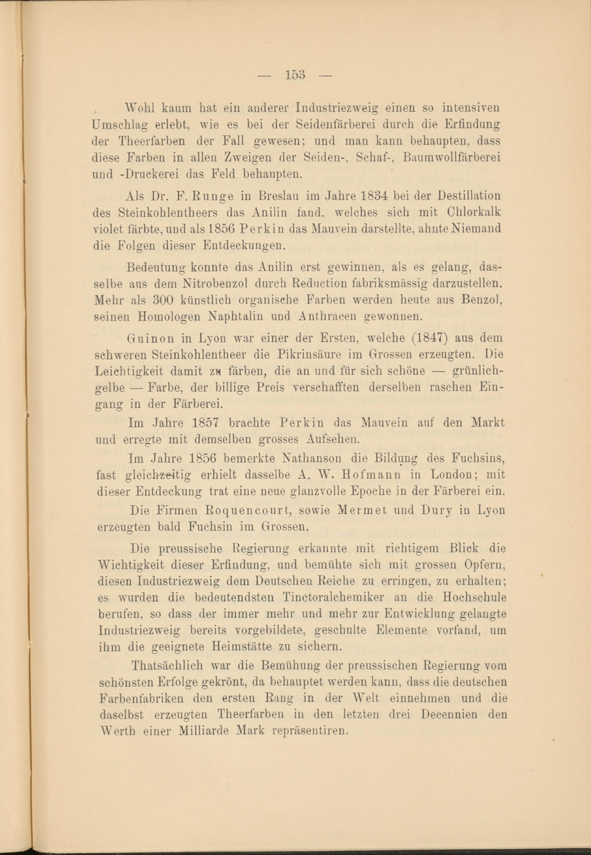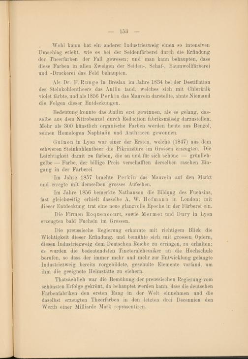 Als Dr. F. Runge in Breslau im Jahre 1834 bei der Destillation des Steinkohlentheers das Anilin fand, welches sich mit Chlorkalk violet färbte, und als 1856 Perkin das Mauvein darstellte, ahnte Niemand die Folgen dieser Entdeckungen.