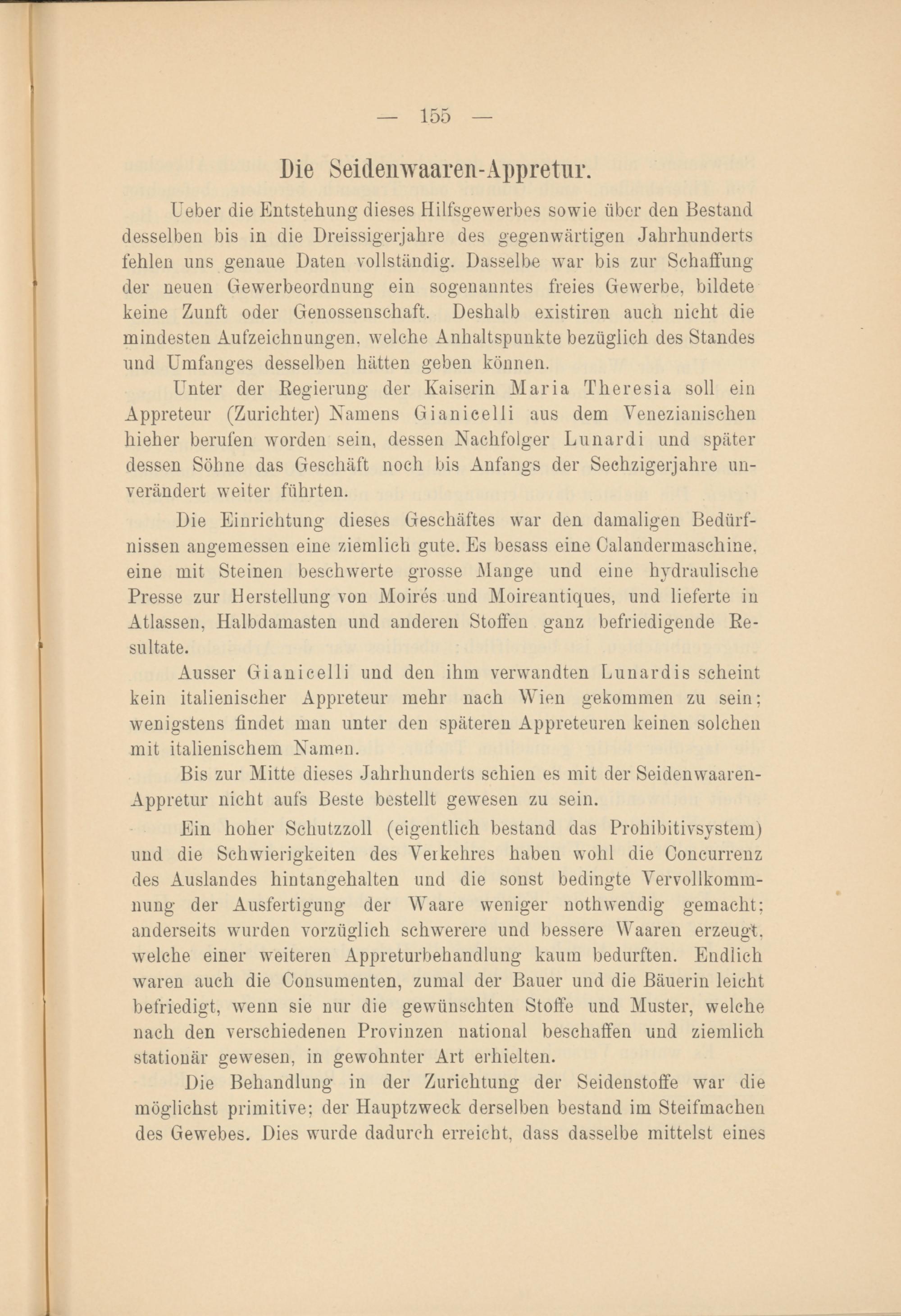 Unter der Regierung der Kaiserin Maria Theresia soll ein Appreteur (Zurichter) Namens Gianicelli aus dem Venezianischen hieher berufen worden sein, dessen Nachfolger Lunar di und später dessen Söhne das Geschäft noch bis Anfangs der Sechzigerjahre unverändert weiter führten.