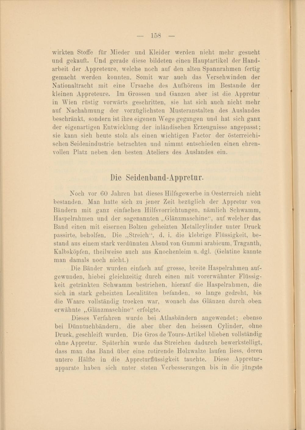 wirkten Stoffe für Mieder und Kleider werden nicht mehr gesucht und gekauft. Und gerade diese bildeten einen Hauptartikel der Handarbeit der Appreteure, welche noch auf den alten Spannrahmen fertig- gemacht werden konnten. Somit war auch das Verschwinden der Nationaltracht mit eine Ursache des Aufhörens im Bestände der kleinen Appreteure. Im Grossen und Ganzen aber ist die Appretur in Wien rüstig vorwärts geschritten, sie hat sich auch nicht mehr auf Nachahmung der vorzüglichsten Musteranstalten des Auslandes beschränkt, sondern ist ihre eigenen Wege gegangen und hat sich ganz der eigenartigen Entwicklung der inländischen Erzeugnisse angepasst; sie kann sich heute stolz als einen wichtigen Factor der österreichischen Seidenindustrie betrachten und nimmt entschieden einen ehrenvollen Platz neben den besten Ateliers des Auslandes ein.