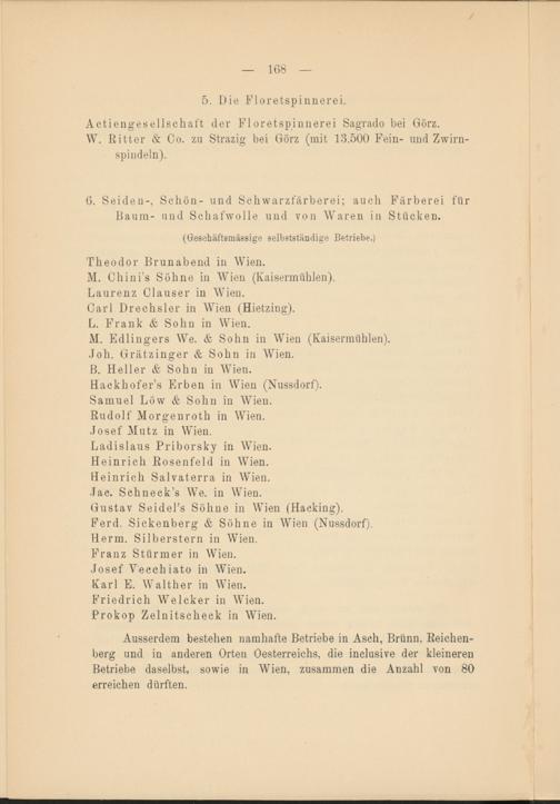 Ausserdem bestehen namhafte Betriebe in Asch, Brünn, Reichenberg und in anderen Orten Oesterreichs, die inclusive der kleineren Betriebe daselbst, sowie in Wien, zusammen die Anzahl von 80 erreichen dürften.