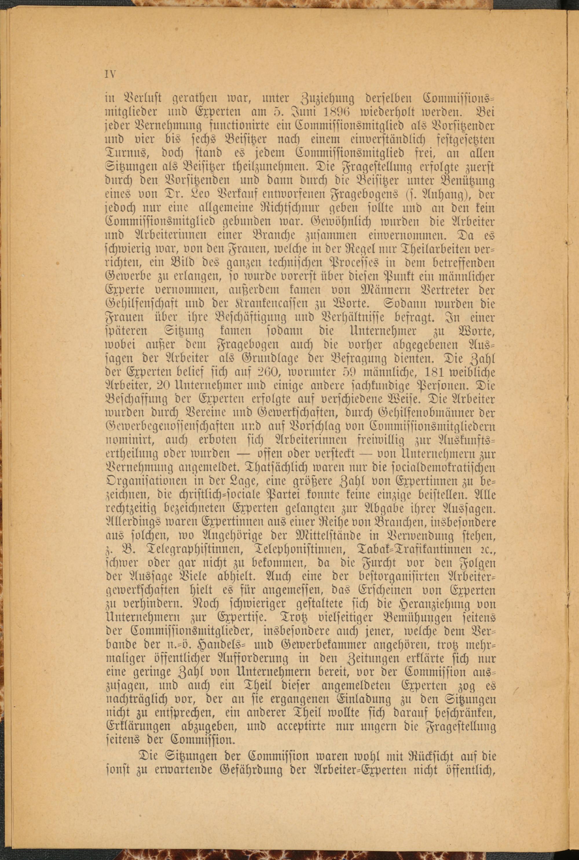 in Verlust gerathen war, unter Zuziehung derselben Commissions- mitglieder und Experten am ö. Juni 1806 wiederholt werden. Bei jeder Vernehmung functionirte ein Commissionsmitglied als Vorsitzender und vier bis sechs Beisitzer nach einem einverständlich festgesetzten Turnus, doch stand es jeden: Eommissionsmitglied frei, an allen Sitzungen als Beisitzer theilzunehmen. Die Fragestellung erfolgte zuerst durch den Vorsitzenden und dann durch die Beisitzer unter Benützung eines von Dr. Leo Verkauf entworfenen Fragebogens (st Anhang), der jedoch nur eine allgemeine Richtschnur geben sollte und an den kein Commissionsmitglied gebunden war. Gewöhnlich wurden die Arbeiter und Arbeiterinnen einer Branche zusammen einvernommen. Da es schwierig war, von den Frauen, welche in der Regel nur Theilarbeilen verrichten, ein Bild des ganzen technischen Processes in dem betreffenden Gewerbe zu erlangen, so wurde vorerst über diesen Punkt ein männlicher Experte vernommen, außerdem kamen von Männern Vertreter der Gehilfenschaft und der Klrankencassen zu Worte. Sodann wurden die Frauen über ihre Beschäftigung und Verhältnisse befragt. In einer späteren Sitzung kamen sodann die Unternehmer zu Worte, wobei außer dem Fragebogen auch die vorher abgegebenen Aussagen der Arbeiter als Grundlage der Befragung dienten. Die Zahl der Experten belief sich auf 260, worunter ö0 männliche, 181 weibliche Arbeiter, 20 Unternehmer und einige andere sachkundige Personen. Die Beschaffung der Experten erfolgte auf verschiedene Weise. Die Arbeiter wurden durch Vereine und Gewerkschaften, durch Gehilfenobmünner der Gewerbegenossenschaften und auf Vorschlag von Commissionsmitgliedern nominirt, auch erboten sich Arbeiterinnen freiwillig zur Ausknnfts- ertheilung oder wurden — offen oder versteckt — von Unternehmern zur Vernehmung angemeldet. Thatsächlich waren nur die socialdemokratischen Organisationen in der Lage, eine größere Zahl von Expertinnen zu bezeichnen, die christlich-sociale Partei konnte keine einzige beistellen. Alle rechtzeitig bezeichneten Experten gelangten zur Abgabe ihrer Aussagen. Allerdings waren Expertinnen aus einer Reihe von Branchen, insbesondere aus solchen, wo Angehörige der Mittelstände in Verwendung stehen, z. B. Telegraphistinnen, Telephonistinnen, Tabak-Trasikantinnen rc., schwer oder gar nicht zu bekommen, da die Furcht vor den Folgen der Aussage Viele abhielt. Auch eine der bestorganisirten Arbeiter- gewerkschaften hielt es für angemessen, das Erscheinen von Experten zu verhindern. Noch schwieriger gestaltete sich die Heranziehung von Unternehmern zur Expertise. Trotz vielseitiger Bemühungen seitens der Commissionsmitglieder, insbesondere auch jener, welche dem Verbände der n.-ö. Handels- und Gewerbekammer angehören, trotz mehrmaliger öffentlicher Aufforderung in den Zeitungen erklärte sich nur eine geringe Zahl von Unternehmern bereit, vor der Commission auszusagen, und auch ein Theil dieser angemeldeten Experten zog es nachträglich vor, der an sie ergangenen Einladung zu den Sitzungen nicht zu entsprechen, ein anderer Theil wollte sich darauf beschränken, Erklärungen abzugeben, und acceptirte nur ungern die Fragestellung seitens der Commission.