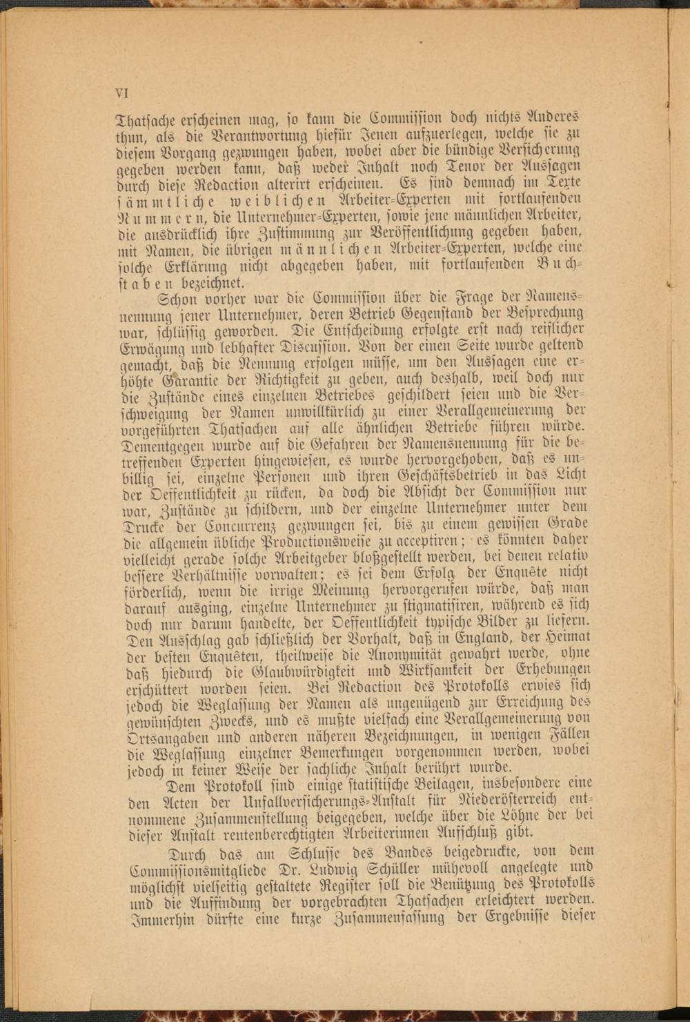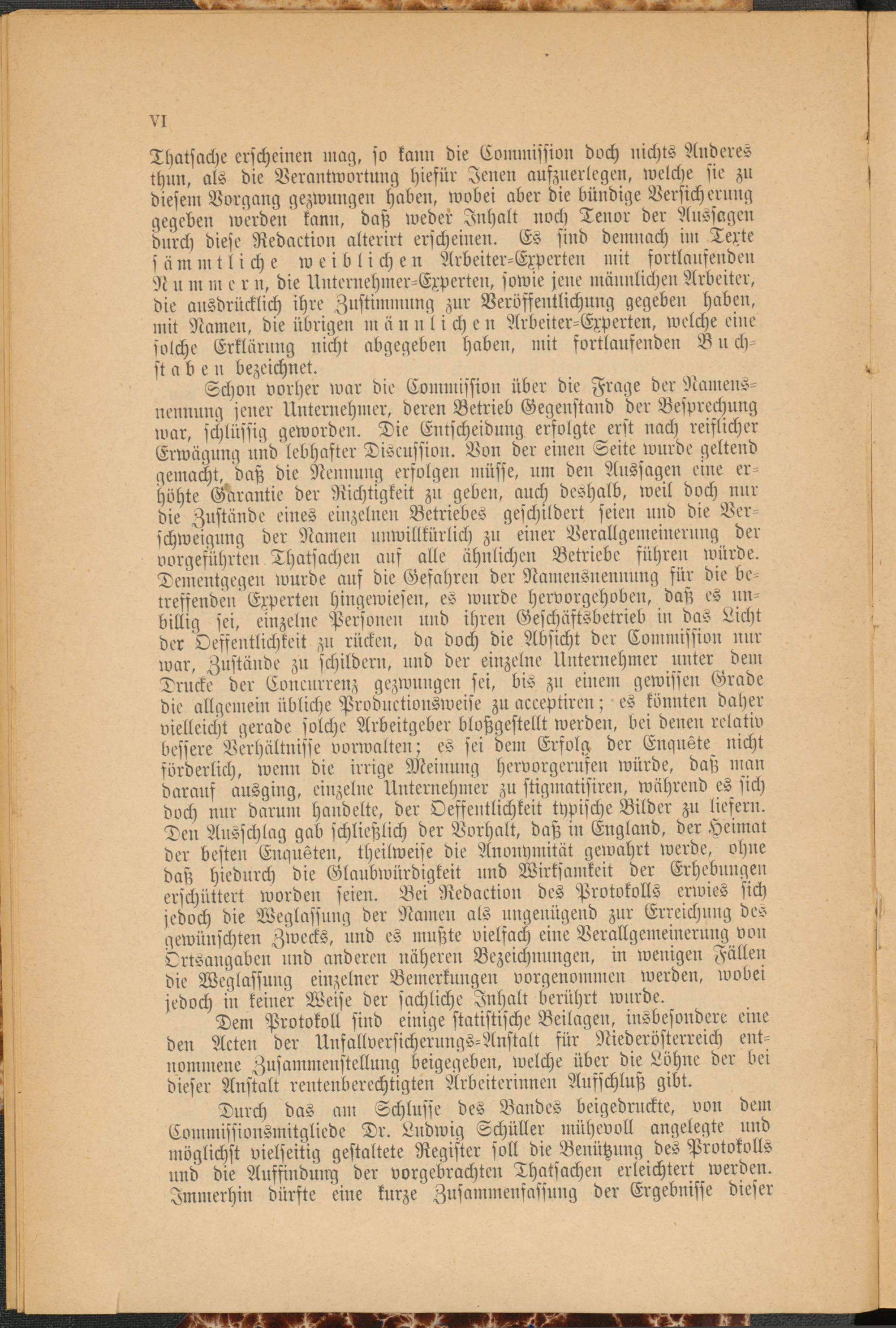 Thatsache erscheinen mag, so kann die Commission doch nichts Anderes thun, als die Verantwortung hiefür Jenen aufzuerlegen, welche sie zu diesem Vorgang gezwungen haben, wobei aber die bündige Versicherung gegeben werden kann, daß weder Inhalt noch Tenor der Aussagen durch diese Redaction alterirt erscheinen. Es sind demnach im Texte sämmtliche weiblichen Arbeiter-Experten mit fortlaufenden N u m m e r n, die Unternehmer-Experten, sowie jene männlichen Arbeiter, die ausdrücklich ihre Zustimmung zur Veröffentlichung gegeben haben, mit Namen, die übrigen m ä nnliche n Arbeiter-Experten, welche eine solche Erklärung nicht abgegeben haben, mit fortlaufenden Buch­staben bezeichnet.