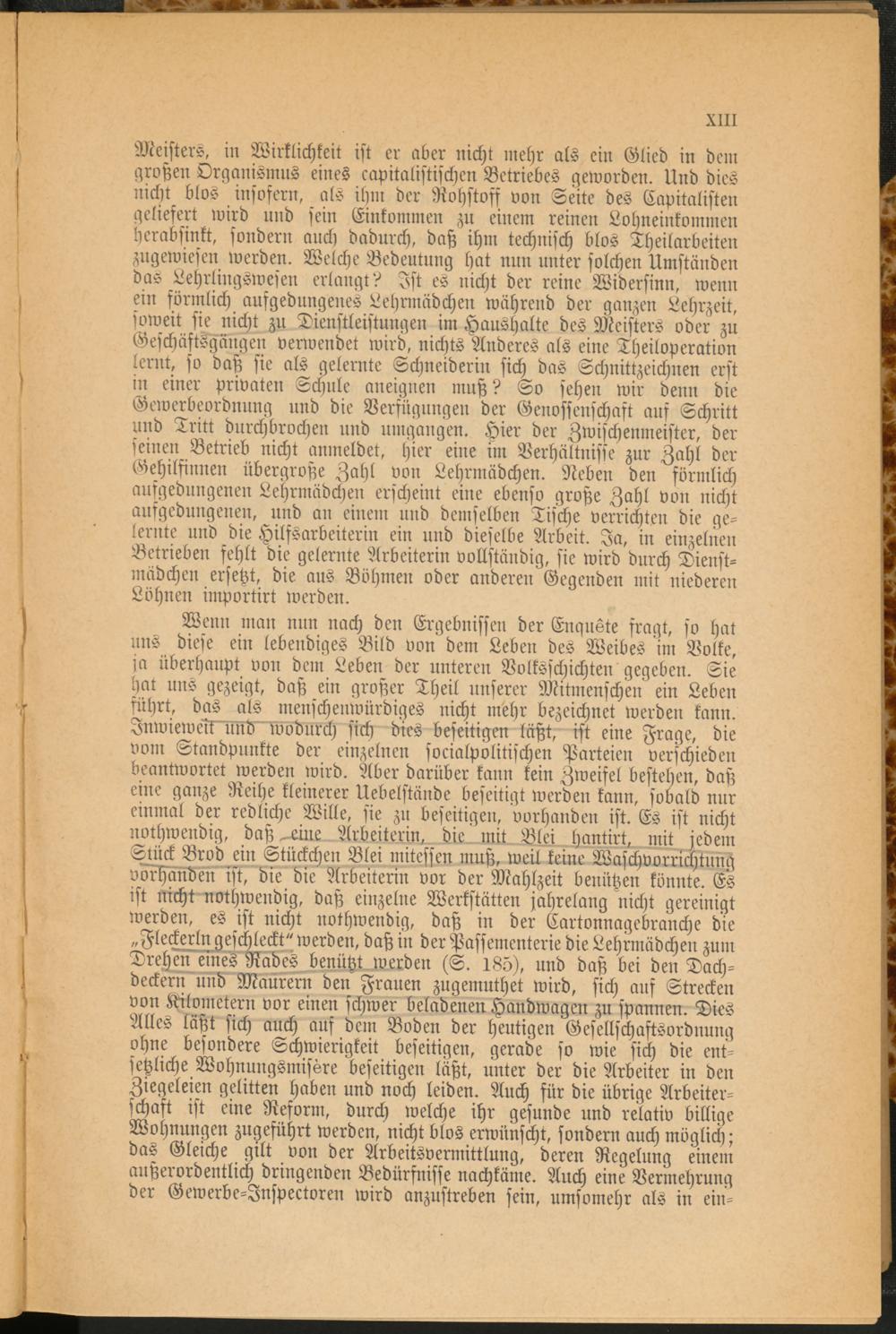 Meisters, in Wirklichkeit ist er aber nicht mehr als ein Glied in dem großen Organismus eines kapitalistischen Betriebes geworden. Und dies nicht blos insofern, als ihm der Rohstoff von Seite des Capitalien geliefert wird und sein Einkommen zu einem reinen Lohneinkommen herabsinkt, sondern auch dadurch, daß ihm technisch blos Theilarbeiten zugewiesen werden. Welche Bedeutung hat nun unter solchen Umständen das Lehrlingswesen erlangt? Ist es nicht der reine Widersinn, wenn ein förmlich ausgedungenes Lehrmädchen während der ganzen Lehrzeit, soweit sie nicht zu Dienstleistungen im Haushalte des Meisters oder zu Geschäftsgängen verwendet wird, nichts Anderes als eine Theiloperation lernt, so daß sie als gelernte Schneiderin sich das Schnittzeichnen erst in einer privaten Schule aneignen muß? So sehen wir denn die Gewerbeordnung und die Verfügungen der Genossenschaft aus Schritt und Tritt durchbrochen und umgangen. Hier der Zwischenmeister, der seinen Betrieb nicht anmeldet, hier eine im Verhältnisse zur Zahl der Gehilfinnen übergroße Zahl von Lehrmädchen. Neben den förmlich ausgehungerten Lehrmädchen erscheint eine ebenso große Zahl von nicht ausgedungenen, und an einem und demselben Tische verrichten die gelernte und die Hilfsarbeitern: ein und dieselbe Arbeit. Ja, in einzelnen Betrieben fehlt die gelernte Arbeiterin vollständig, sie wird durch Dienstmädchen ersetzt, die aus Böhmen oder anderen Gegenden mit niederen Löhnen importirt werden.