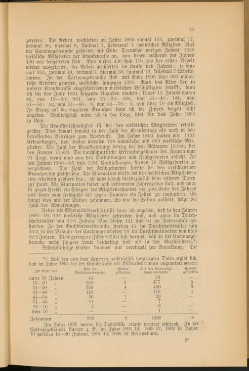 Im Jahre 1895 waren die Todesfälle relativ weniger zahlreich. In der Cartonagebranche starben z. B. im Jahre 1894 13. 1893 12, 1892 16 (davon 10 zwischen 14—20 Jahren), 1891 15, 1890 12 Arbeiterinnen.