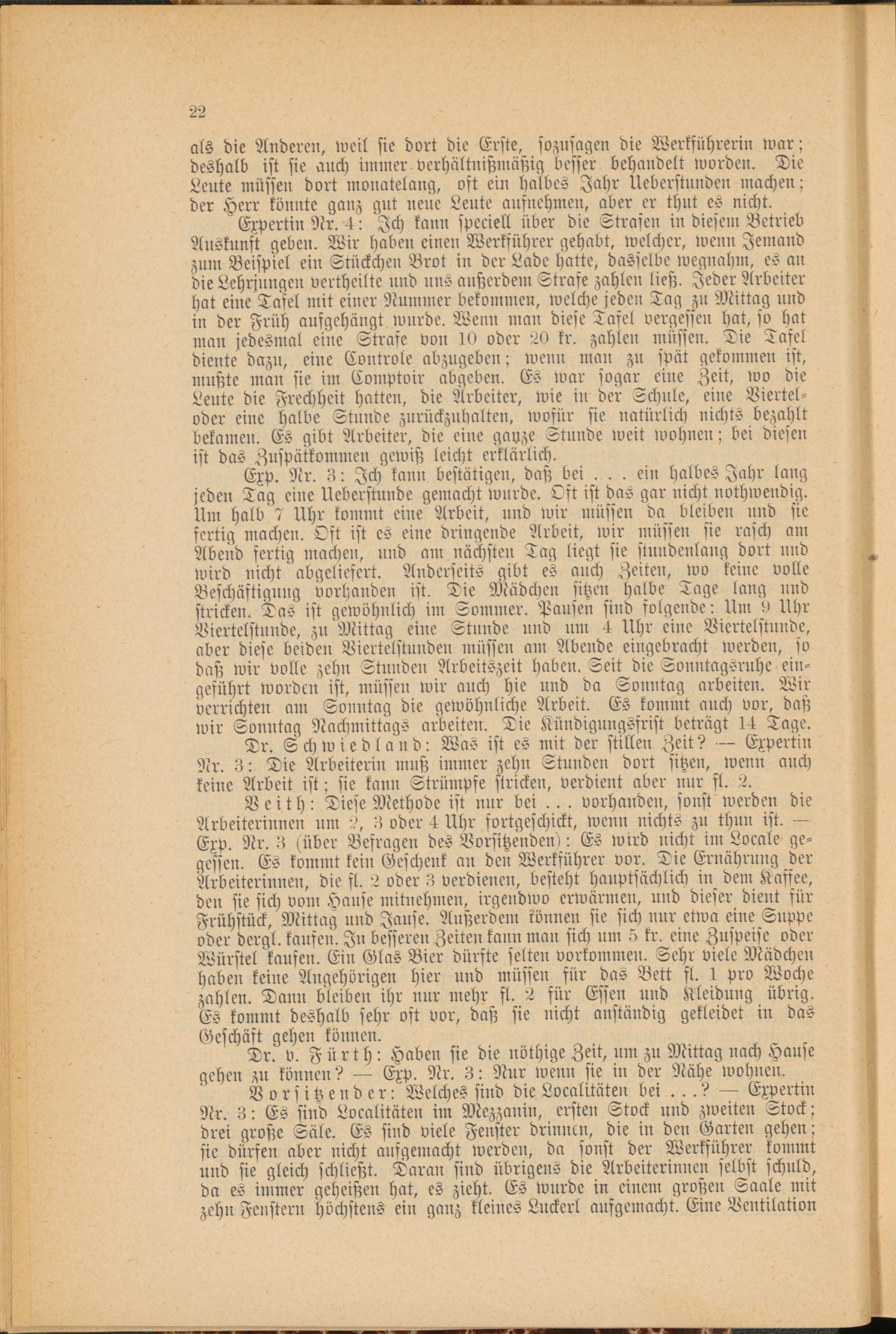 Exp. Nr. 3: Ich kann bestätigen, daß bei . . . ein halbes Jahr lang jeden Tag eine Ueberstunde gemacht wurde. Oft ist das gar nicht nothwendig. Um halb 7 Uhr kommt eine Arbeit, und wir müssen da bleiben und sie fertig machen. Oft ist es eine dringende Arbeit, wir müssen sie rasch am Abend fertig machen, und am nächsten Tag liegt sie stundenlang dort und wird nicht abgeliefert. Anderseits gibt es auch Zeiten, wo keine volle Beschäftigung vorhanden ist. Die Mädchen sitzen halbe Tage lang und stricken. Das ist gewöhnlich im Sommer. Pansen sind folgende: Um o Uhr Viertelstunde, zu Mittag eine Stunde und um 4 Uhr eine Viertelstunde, aber diese beiden Viertelstunden müsset: am Abende eingebracht werden, so daß wir volle zehn Stunden Arbeitszeit haben. Seit die Sonntagsruhe eingeführt worden ist, müssen wir auch hie und da Sonntag arbeiten. Wir verrichten an: Sonntag die gewöhnliche Arbeit. Es kommt auch vor, daß wir Sonntag Nachmittags arbeiten. Die Kündigungsfrist betrügt 14 Tage.