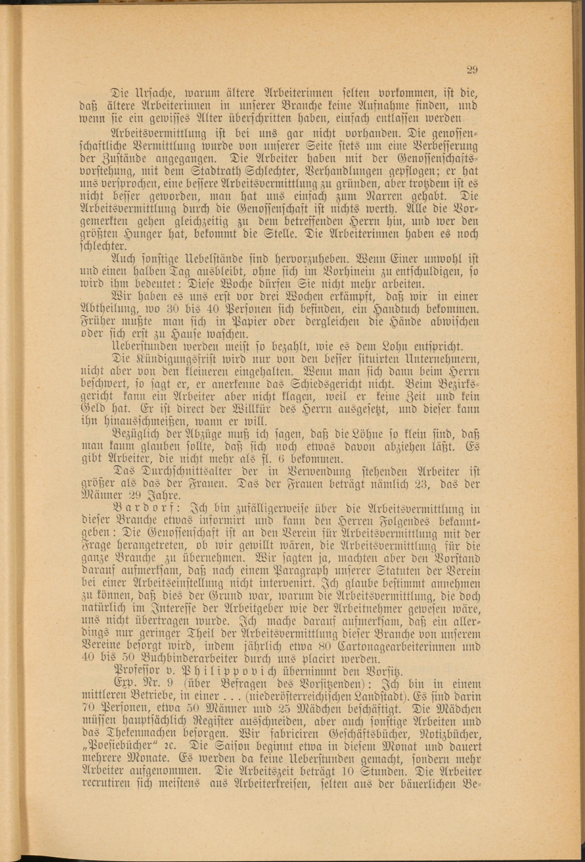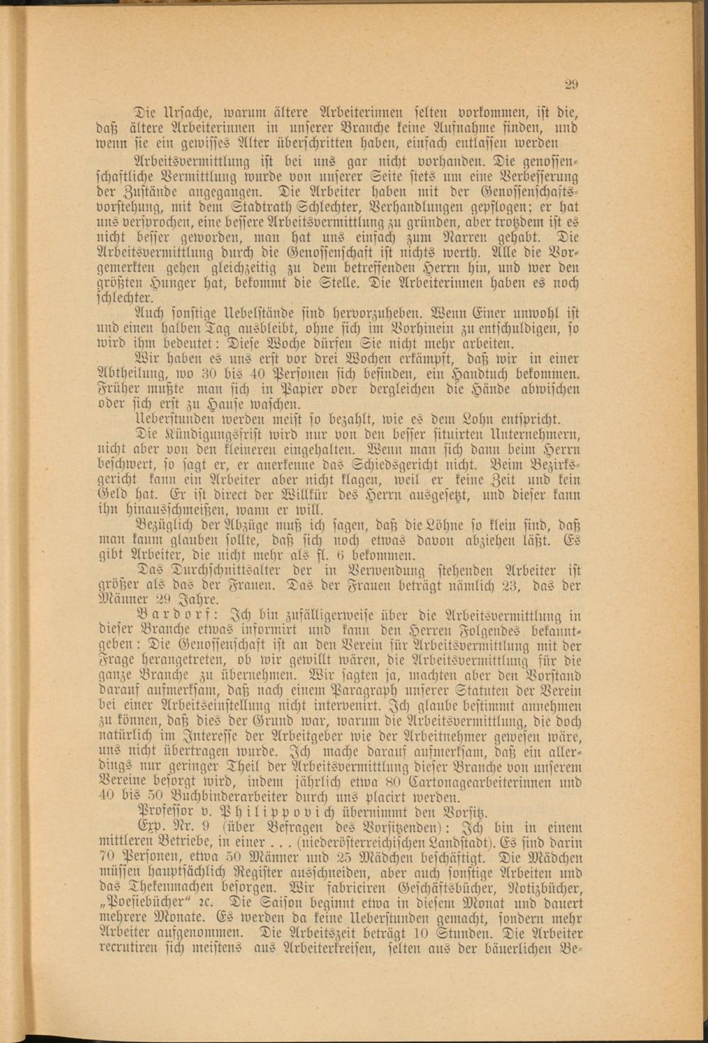 Exp. Nr. 9 (über Befragen des Vorsitzenden): Ich bin in einem mittleren Betriebe, in einer ... (uiederösterreichischen Landstadt). Es sind darin 70 Personen, etwa 50 Männer und 25 Mädchen beschäftigt. Die Mädchen müssen hauptsächlich Register ausschneiden, aber auch sonstige Arbeiten und das Thekenmachen besorgen. Wir sabriciren Geschäftsbücher, Notizbücher, „Poesiebücher" rc. Die Saison beginnt etwa in diesem Monat und dauert mehrere Monate. Es werden da keine Ueberstnnden gemacht, sondern: mehr Arbeiter ausgenommen. Die Arbeitszeit beträgt 10 Stunden. Die Arbeiter recrutiren sich meistens aus Arbeiterkreisen, selten aus der bäuerlichen Be-