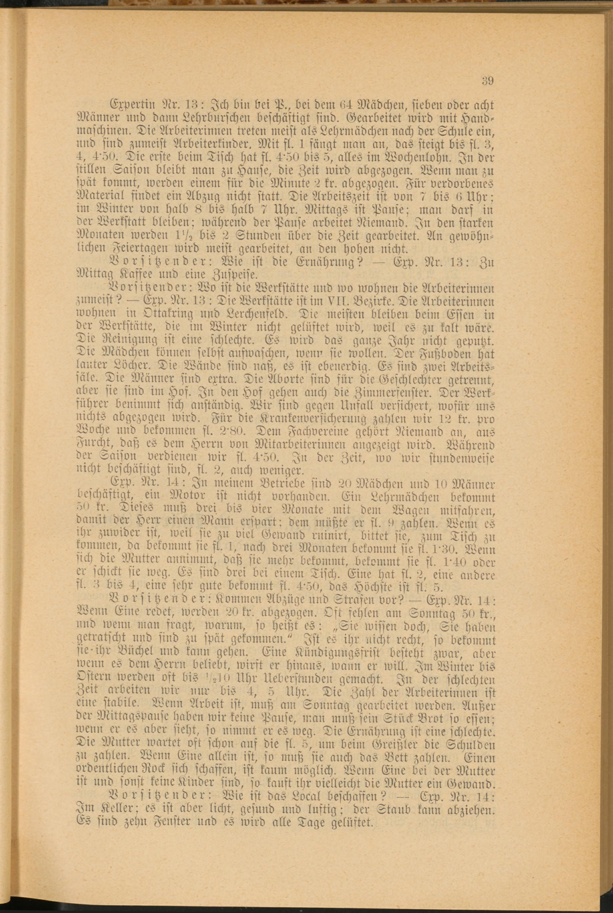 Vorsitzender: Wo ist die Werkstätte und wo wohnen die Arbeiterinnen zumeist ? Exp. Nr. 13 : Die Werkstätte ist im Vlk. Bezirke. Die Arbeiterinnen wohnen in Sttakring und Lerchenfeld. Die meisten bleiben beim Essen in der Werkstätte, die im Winter nicht gelüftet wird, weil es zu kalt wäre. Die Reinigung ist eine schlechte. Es wird das ganze Jahr nicht geputzt. Die Mädchen können selbst aufwaschen, wenn sie wollen. Der Fußboden hat lauter Löcher. Die Wände sind naß, es ist ebenerdig. Es sind zwei Arbeits­säle. Die Männer find extra. Die Aborte sind für die Geschlechter getrennt, aber sie sind im Hos. In den Hof gehen auch die Zimmersenster. Der Werk­führer benimmt sich anständig. Wir sind gegen Unfall versichert, wofür uns nichts abgezogen wird. Für die Krankenversicherung zahlen wir 12 kr. pro Woche und bekommen sl. 2',30. Dem Faelwercine gehört Niemand an, aus Furcht, daß es dem Herru vou Mitarbeiterinnen angezeigt wird. Während der Saison verdienen wir sl. 4'30. In der Zeit, wo wir stundenweise nicht beschäftigt sind, sl. 2, auch weniger.