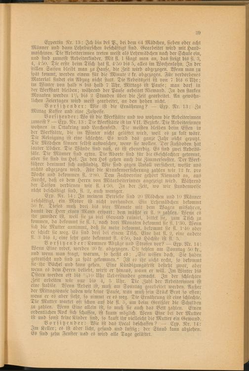 Expertin Nr. 13: Ich bin bei P., bei dem 34 Mädchen, sieben oder acht Männer und dann Lehrbnrschen beschäftigt sind. Gearbeitet wird mit Hand- maschinen. Die Arbeiterinnen treten meist als Lehrmädchen nach der Schuft ein, und sind zumeist Arbeiterkinder. Mit sl. 1 sängt man an, das steigt bis sl. 3, 4, 43o. Die erste beim Tisch hat sl. 4'30 bis ii, alles im Wocheulohu. In der stillen Saison bleibt man zu Hanse, die Zeit wird abgezogen. Wenn man zu spät kommt, werden einem für die Minute 4 kr. abgezogen. Für verdorbenes Material findet ein Abzug nicht statt. Die Arbeitszeit ist von 7 bis 3 Uhr; im Winter von halb 3 bis halb 7 Uhr. Mittags ist Pause; man darf in der Werkstatt bleiben; während der Pause arbeitet Niemand. In den starken Monaten werden UZ bis 2 Stunden über die Zeit gearbeitet. An gewöhn­lichen Feiertagen wird meist gearbeitet, an den hohen nicht.