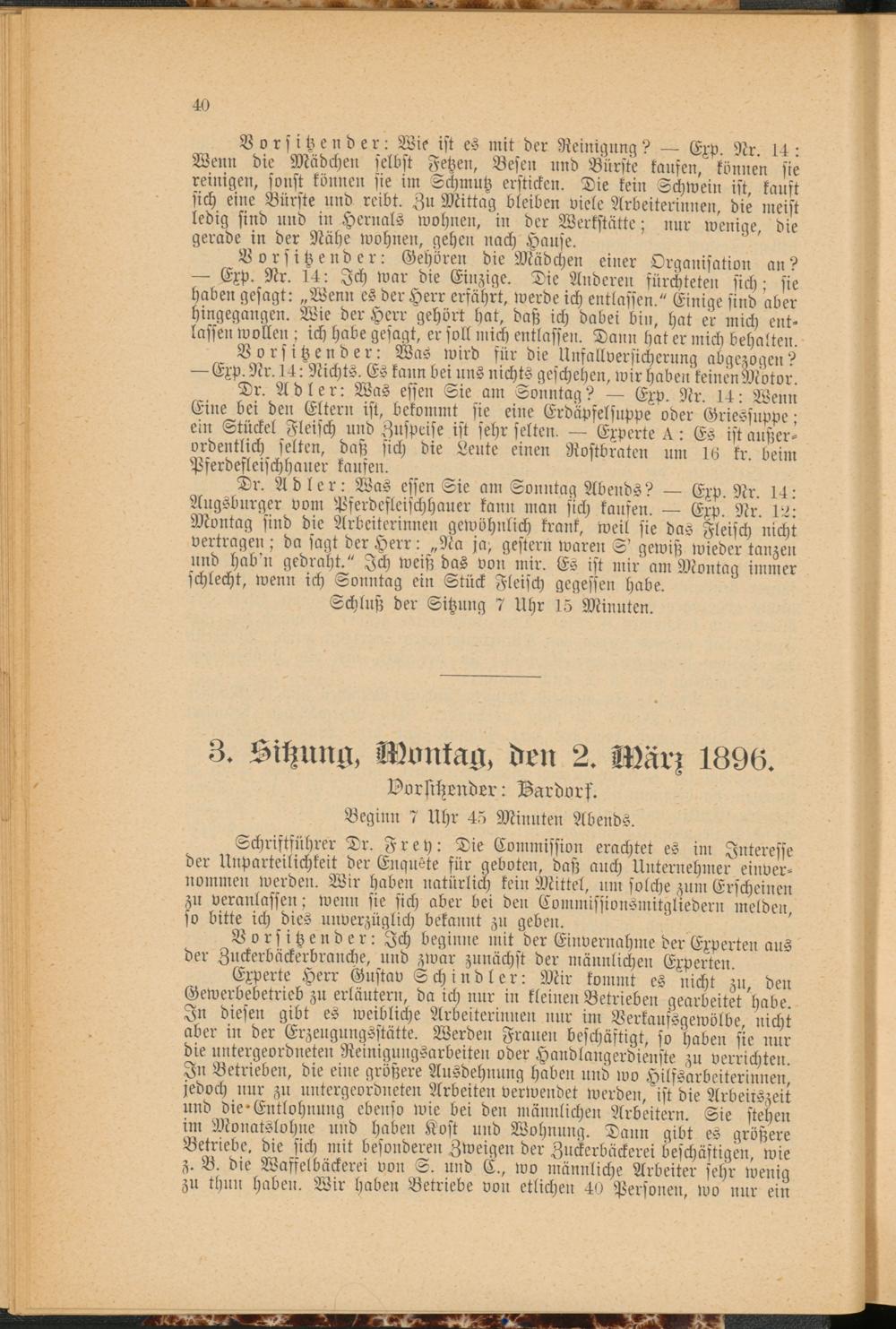 Dr. Adler: Was essen Sie am Sonntag ? — Exp. Nr. 14: Wenn Eine bei den Eltern ist, bekommt sie eine Erdäpfelsuppe oder Griessuppe; ein Stückel Fleisch und Zuspeise ist sehr selten. — Experte ^: Es ist außerordentlich selten, daß sich die Leute einen Rostbraten um 16 kr. beim Pserdesleischhauer kaufen.