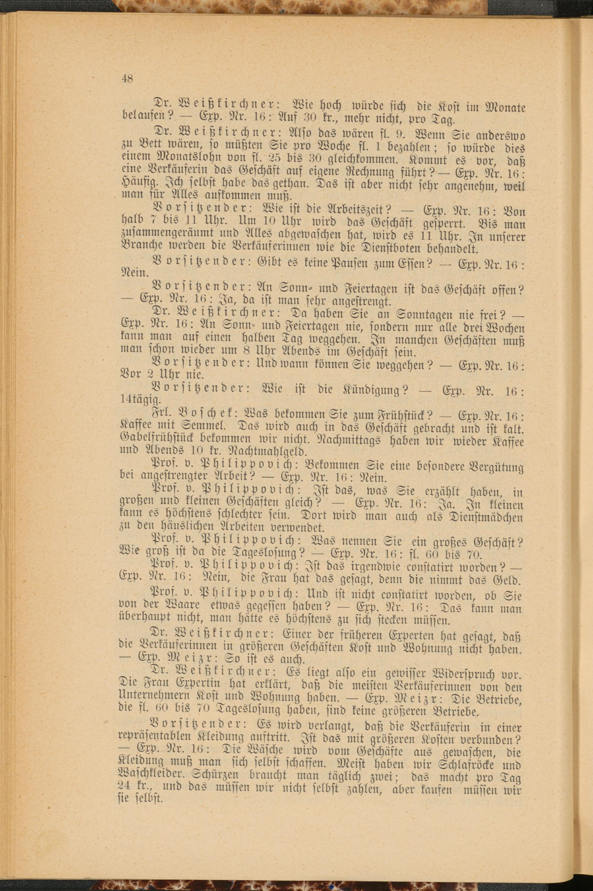 Pros. v. Philippovich: Ist das, was Sie erzählt haben, in großen und kleinen Geschäften gleich? Exp. Nr. 16: Ja. In kleinen kann es höchstens schlechter sein. Dort wird man auch als Dienstmädchen zu den häuslichen Arbeiten verwendet.