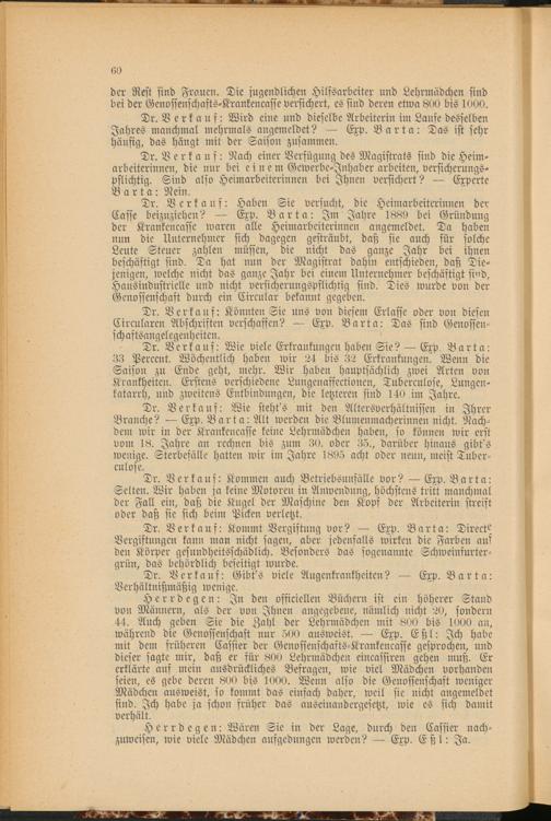 Dr. Verkauf: Wie steht's mit den Altersverhältnissen in Ihrer Branche? — Exp. Barta: Alt werden die Blumenmacherinnen nicht. Nachdem wir in der Krankencasse keine Lehrmädchen haben, so können wir erst vom 18. Jahre an rechnen bis zum 30. oder 35., darüber hinaus gibt's wenige. Sterbesälle hatten wir im Jahre 1895 acht oder neun, meist Tuberculose.
