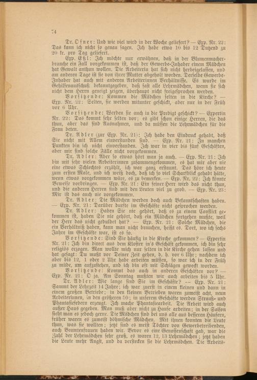 Dr. Adler: Aber so etwas hört man ja auch. Exp. Nr. 21: Ich bin mit sehr vielen Arbeiterinnen zusammengekommen, es hat mir aber nie eine etwas Schlechtes erzählt, ich war ganz erstaunt. Das höre ich heute zum ersten Male, und ich weiß doch, daß ich so viel Scharfblick gehabt hätte, wenn etwas vorgekommen wäre, es zu bemerken. Exp. Nr. 22: Ich könnte Beweise vorbringen. Exp. Nr. 21: Ein feiner Herr wird das nicht thun, und die anderen Herren sind mit den Leuten viel zu grob. Exp. Nr. 23: Mir ist das auch nie vorgekommen.