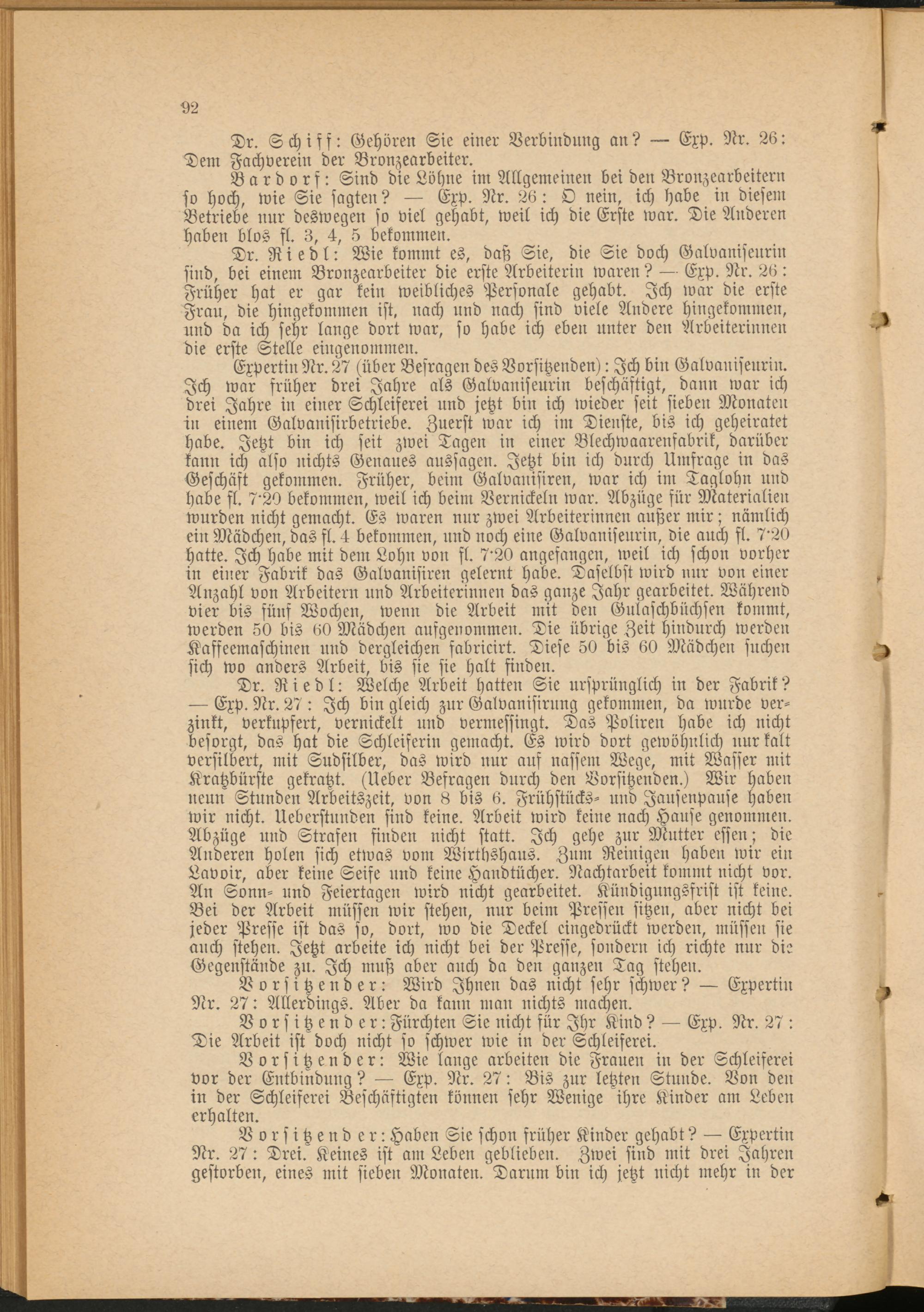Bardorf: Sind die Löhne im Allgemeinen bei den Bronzearbeitern so hoch, wie Sie sagten? — Exp. Nr. 26: O nein, ich habe in diesem Betriebe nur deswegen so viel gehabt, weil ich die Erste war. Die Anderen haben blos fl. 3, 4, 5 bekommen.