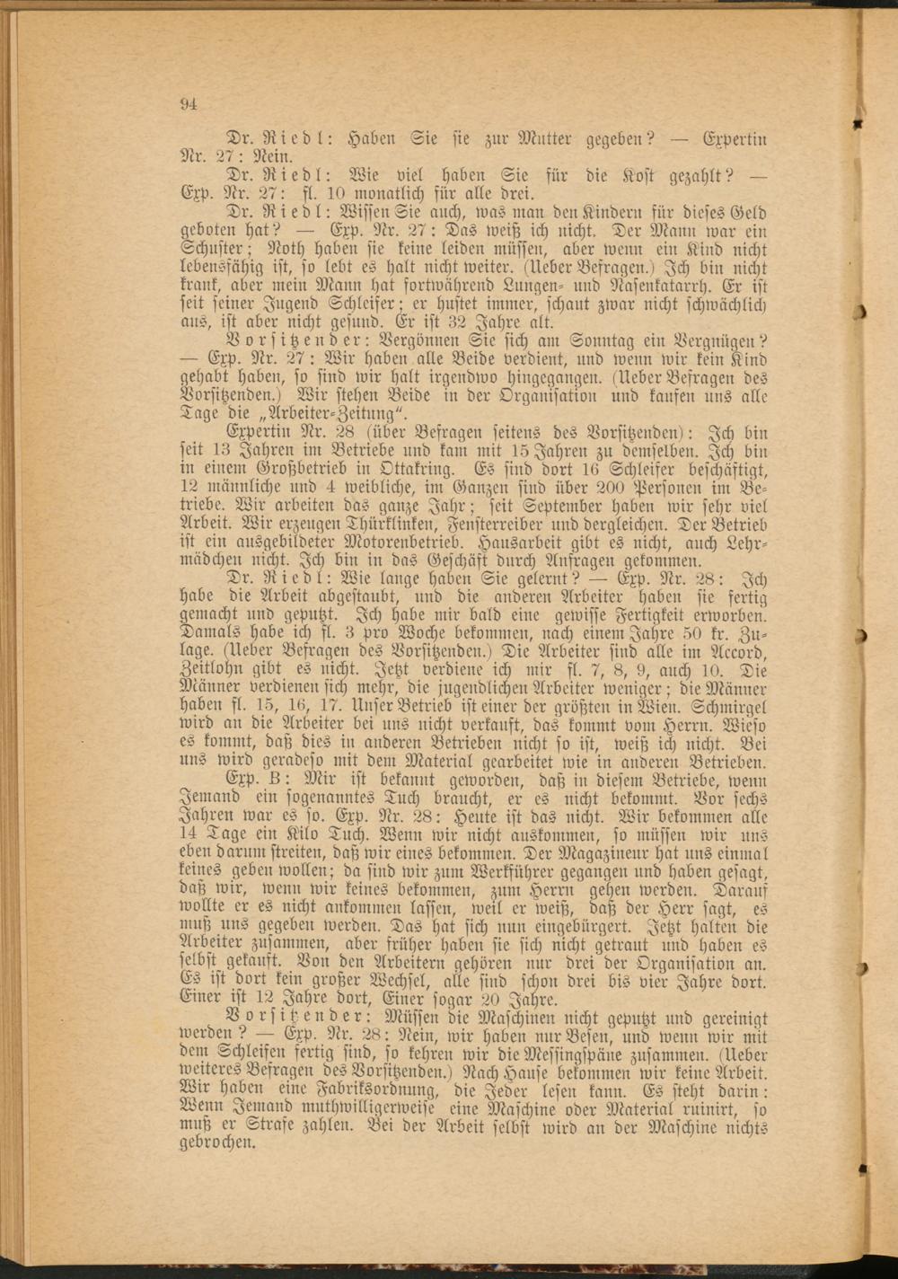 Dr. Riedl: Wie lange haben Sie gelernt? Exp. Nr. 28: Ich habe die Arbeit abgestaubt, und die anderen Arbeiter haben sie fertig gemacht und geputzt. Ich habe mir bald eine gewisse Fertigkeit erworben. Damals habe ich fl. 3 pro Woche bekommen, nach einem Jahre 50 kr. Zu­lage. (Ueber Befragen des Vorsitzenden.) Die Arbeiter sind alle im Accord, Zeitlohn gibt es nicht. Jetzt verdiene ich mir fl. 7, 8, 9, auch 10. Die Männer verdienen sich mehr( die jugendlichen Arbeiter weniger; die Männer haben fl. 15, 16, 17. Unser Betrieb ist einer der größten in Wien. Schmirgel wird an die Arbeiter bei uns nicht verkauft, das kommt vom Herrn. Wieso es kommt, daß dies in anderen Betrieben nicht so ist, weiß ich nicht. Bei uns wird geradeso mit dem Material gearbeitet wie in anderen Betrieben.