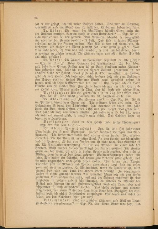 — Exp. Nr. 28: Ja. (Ueber Befragen des Vorsitzenden.) Ich bin ledig und habe keine Eltern. Früher war ich zu Bette. Nachdem meine Zimmerfrau gestorben war, habe ich mir ein eigenes Cabinet genommen in der nächsten Nähe der Fabrik. Dort zahle ich fl. 4'50 monatlich. Zu Mittag gehe ich nach Haufe. Ich koche aber nicht, sondern hole mir vom Gasthause eine Suppe oder ein Krügel Bier und Wurst dazu. Frühstück nehme ich keines, weil ich keine Kaffeefreundin bin. Um 10 Uhr nehme ich ein Paar Würstel und ein Seidel Bier. Zur Jause kaufe ich mir um 1 kr. Brot und ein Seidel Bier. Abends mache ich Thee, oder ich kaufe mir wieder Bier.