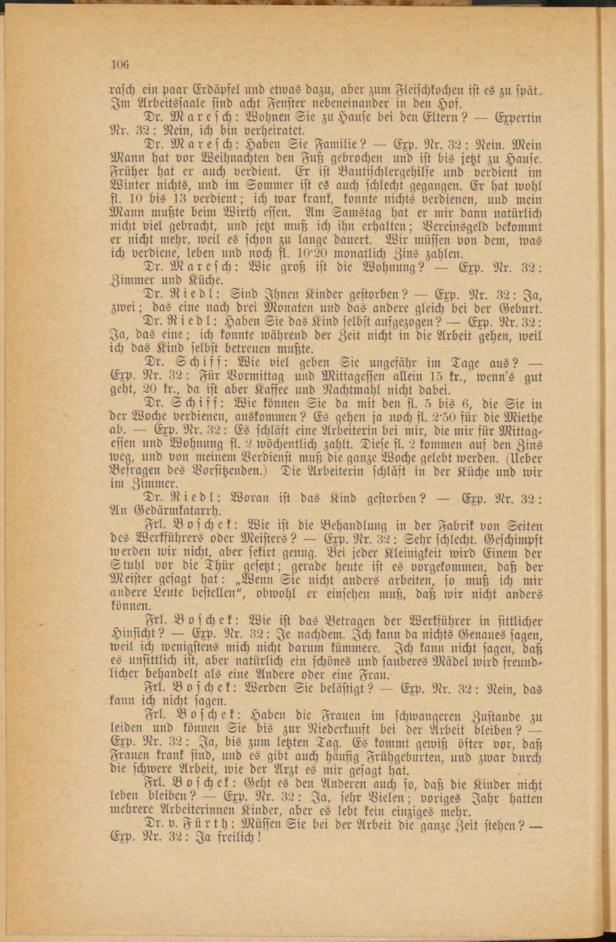 Dr. Schiff: Wie können Sie da mit den fl. 5 bis 6, die Sie in der Woche verdienen, auskommen? Es gehen ja noch fl. 2'50 für die Miethe ab. — Exp. Nr. 32: Es schläft eine Arbeiterin bei mir, die mir für Mittagessen und Wohnung fl. 2 wöchentlich zahlt. Diese fl. 2 kommen auf den Zins weg, und von meinem Verdienst muß die ganze Woche gelebt werden. (Ueber Befragen des Vorsitzenden.) Die Arbeiterin schläft in der Küche und wir im Zimmer.