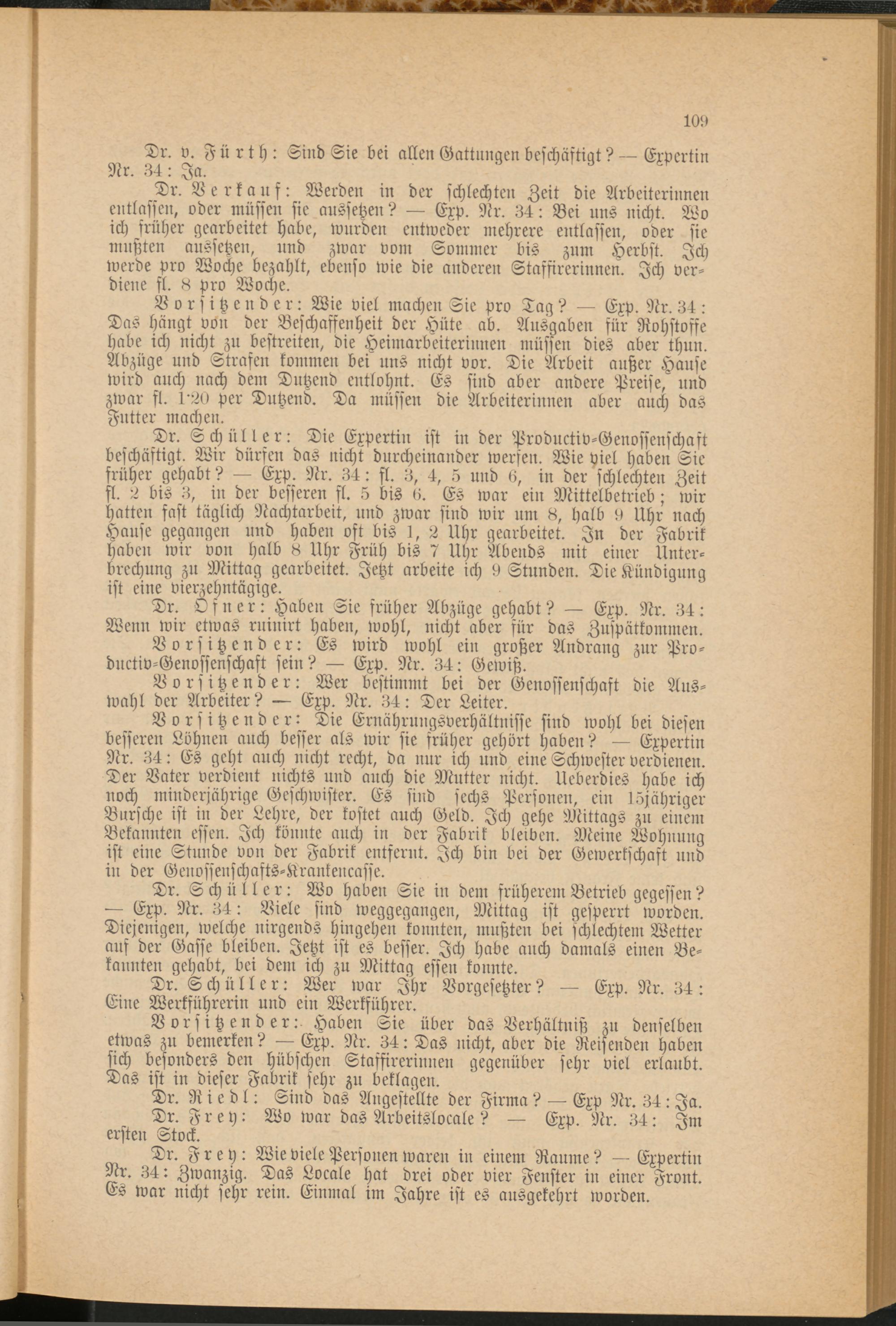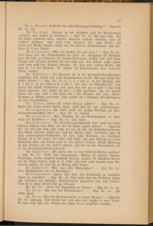 Dr. Verkauf: Werden in der schlechten Zeit die Arbeiterinnen entlassen, oder müssen sie aussetzen? — Exp. Nr. 34: Bei uns nicht. Wo ich früher gearbeitet habe, wurden entweder mehrere entlassen, oder sie mußten aussetzen, und zwar vom Sommer bis zum Herbst. Ich werde pro Woche bezahlt, ebenso wie die anderen Stasfirerinnen. Ich verdiene fl. Pro Woche.