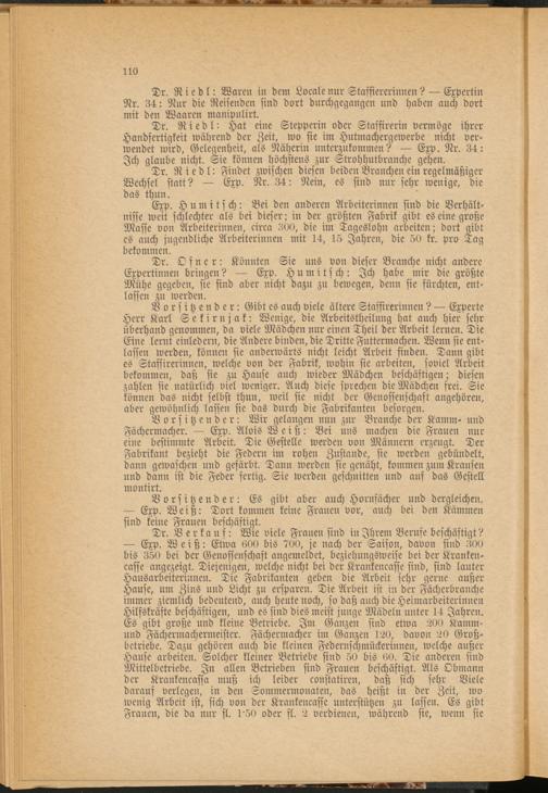 Dr. Riedl: Hat eine Stepperin oder Staffirerin vermöge ihrer Handfertigkeit während der Zeit, wo sie im Hutmachergewerbe nicht ver­wendet wird, Gelegenheit, als Näherin unterzukommen? Exp. Nr. 34: Ich glaube nicht. Sie können höchstens zur Strohhutbranche gehen.