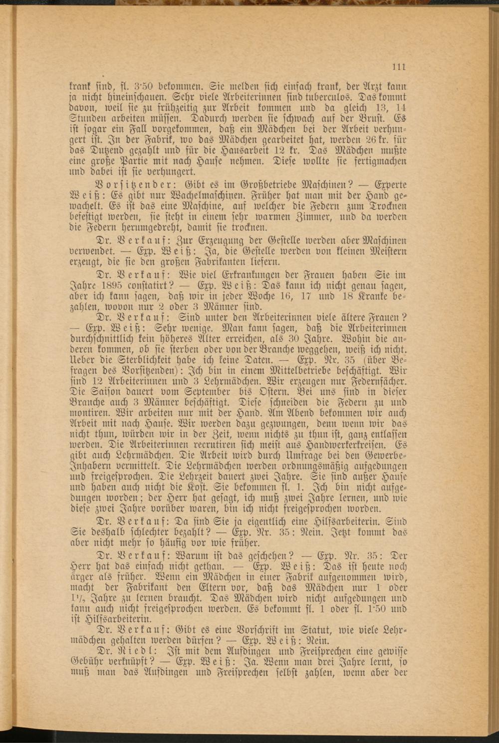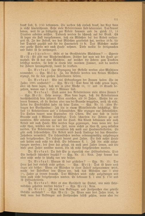 Dr. Verkauf: Sind unter den Arbeiterinnen viele ältere Frauen ? — Exp. Weiß: Sehr wenige. Man kann sagen, daß die Arbeiterinnen durchschnittlich kein höheres Alter erreichen, als 30 Jahre. Wohin die anderen kommen, ob sie sterben oder von der Branche weggehen, weiß ich nicht. Ueber die Sterblichkeit habe ich keine Daten. — Exp. Nr. 35 (über Befragen des Vorsitzenden): Ich bin in einem Mittelbetriebe beschäftigt. Wir sind 12 Arbeiterinnen und 3 Lehrmädchen. Wir erzeugen nur Federnfächer. Die Saison dauert vom September bis Ostern. Bei uns sind in dieser Branche auch 3 Männer beschäftigt. Diese schneiden die Federn zu und montiren. Wir arbeiten nur mit der Hand. Am Abend bekommen wir auch Arbeit mit nach Hause. Wir werden dazu gezwungen, denn wenn wir das nicht thun, würden wir in der Zeit, wenn nichts zu thun ist, ganz entlassen werden. Die Arbeiterinnen recrutiren sich meist aus Handwerkerkreisen. Es gibt auch Lehrmädchen. Die Arbeit wird durch Umfrage bei den Gewerbe- Inhabern vermittelt. Die Lehrmädchen werden ordnungsmäßig aufgedungen und freigesprochen. Die Lehrzeit dauert zwei Jahre. Sie sind außer Hause und haben auch nicht die Kost. Sie bekommen fl. 1 . Ich bin nicht aufgedungen worden; der Herr hat gesagt, ich muß zwei Jahre lernen, und wie diese zwei Jahre vorüber waren, bin ich nicht freigesprochen worden.