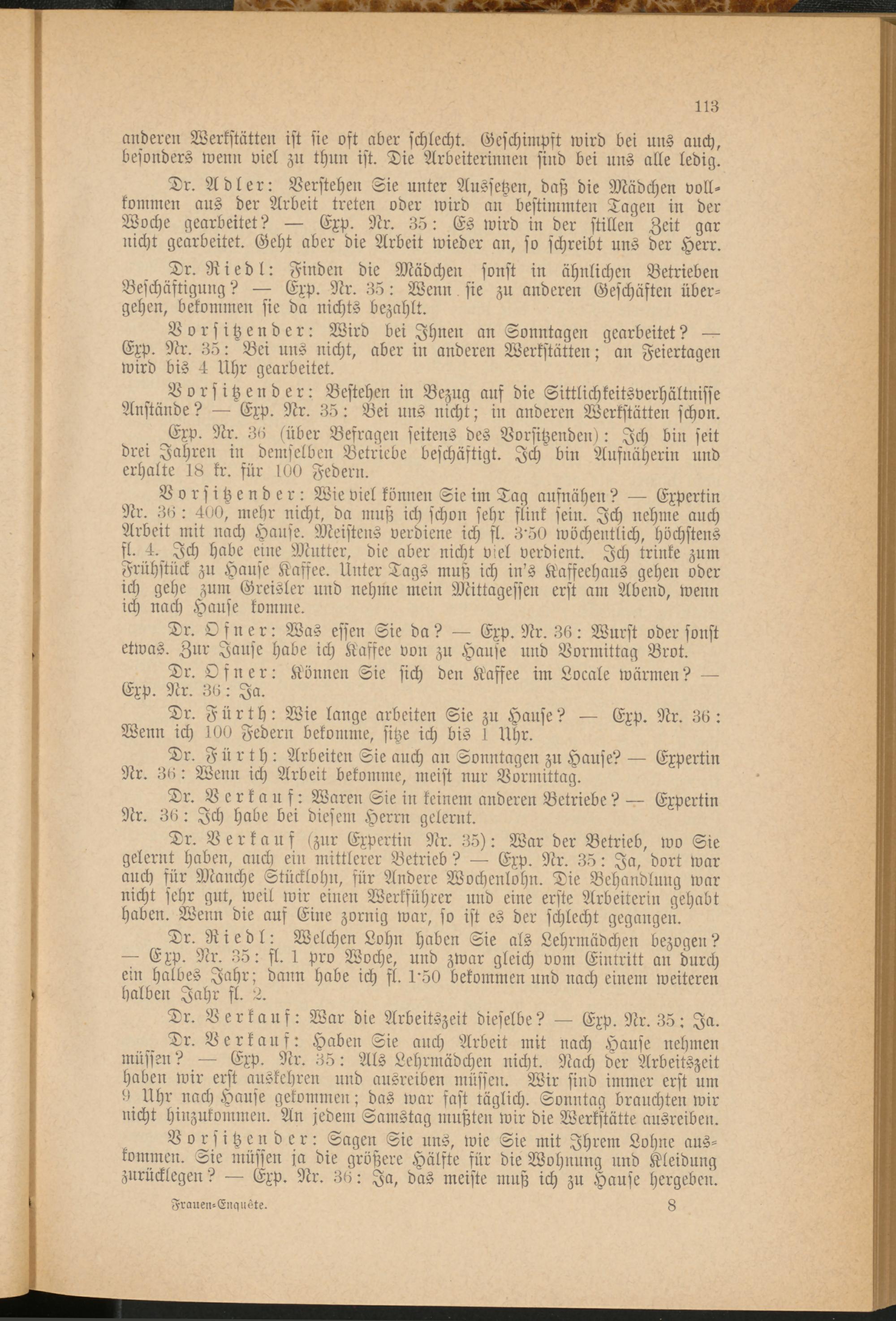 Dr. Riedl: Welchen Lohn haben Sie als Lehrmädchen bezogen? — Exp. Nr. 35: sl. 1 pro Woche, und zwar gleich vom Eintritt an durch ein halbes Jahr; dann habe ich fl. U50 bekommen und nach einem weiteren halben Jahr fl. 2.