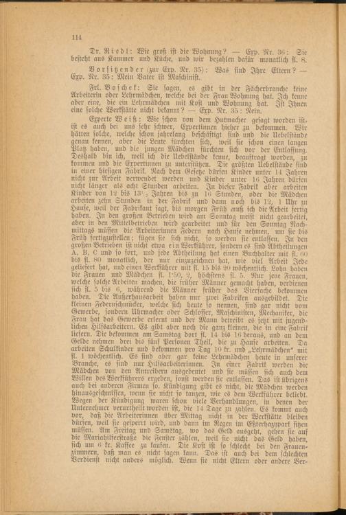 Frl. Bosch ek: Sie sagen, es gibt in der Fächerbranche keine Arbeiterin oder Lehrmädchen, welche bei der Frau Wohnung hat. Ich kenne aber eine, die ein Lehrmädchen mit Kost und Wohnung hat. Ist Ihnen eine solche Werkstätte nicht bekannt? — Exp. Nr. 35: Nein.